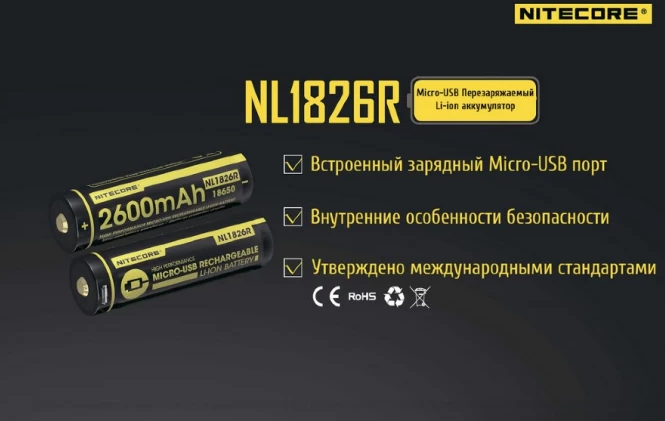 Nitecore NL1826R - новая линейка литиево-ионных аккумуляторов с возможностью зарядки через USB. Основным преимуществом данных аккумуляторов является наличие встроенного Micro-USB порта, который размещен на боковой стороне аккумулятора со стороны положительной полярности.