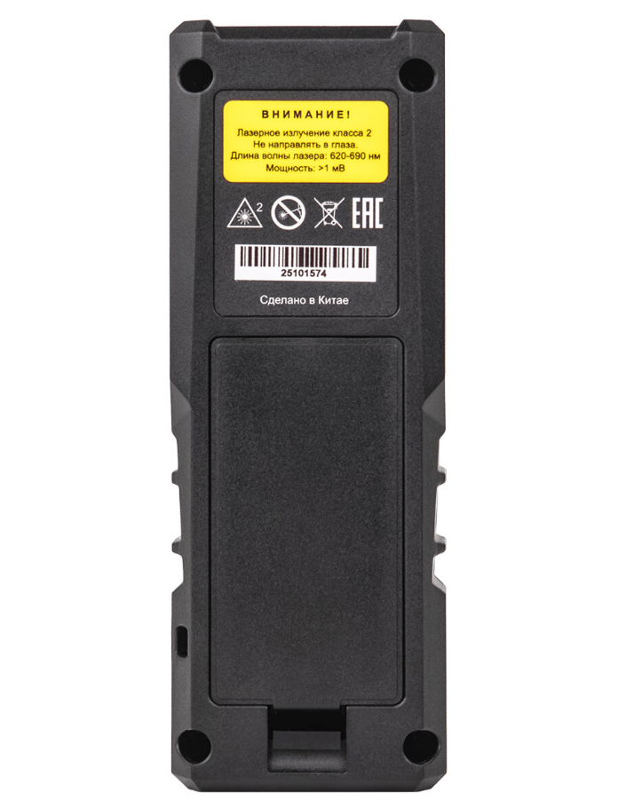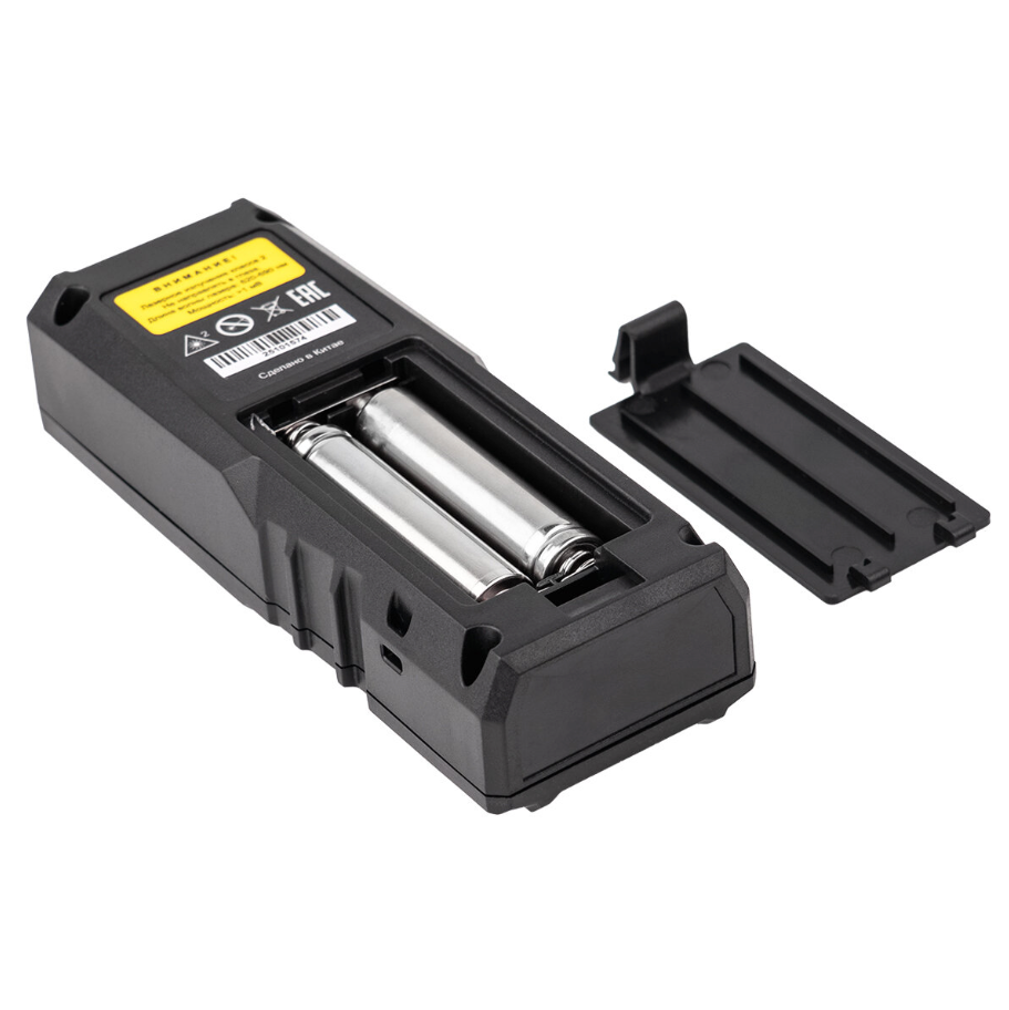 Лазер класса II безопасен для кратковременного контакта с глазами и не требует специальных средств защиты. Корпус устойчив к повседневным нагрузкам, а питание от двух щелочных батареек AAA обеспечивает до 5 000 измерений на одном комплекте.