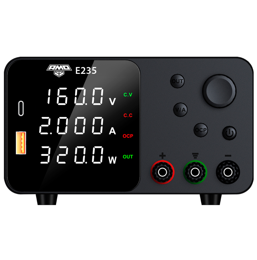 Помимо основного регулируемого выхода, AMO E235 оснащен двумя USB-разъемами — USB-A и USB-C — которые позволяют одновременно заряжать смартфоны, планшеты, измерительные клещи или другие периферийные устройства. Общая мощность USB-портов достигает 18 Вт, что соответствует современным стандартам быстрой зарядки. Трехразрядный цифровой дисплей выводит не только напряжение и ток, но и мгновенную мощность в ваттах, что упрощает расчет тепловых и энергетических параметров нагрузки.