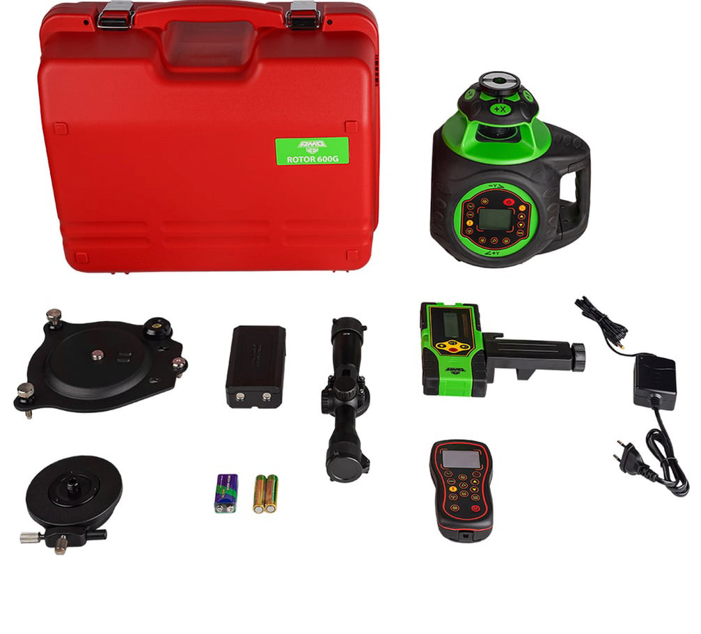 Ротационный лазерный нивелир AMO ROTOR 600G с зеленым лучом превосходит по функционалу предложения от именитых брендов и может предложить уникальные возможности, которых нет у конкурентов. Диаметр рабочей зоны составляет 600 метров при точности луча ±0,05 мм/м. Приемник лазерного излучения включен в комплект.