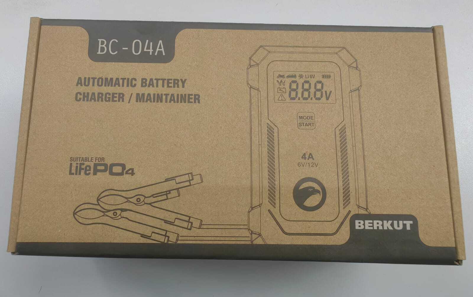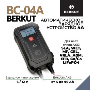 Зарядное устройство BERKUT BC-04A — полностью автоматическое устройство, предназначенное для обслуживания и зарядки 6 и 12-Вольтовых аккумуляторных батарей емкостью от 4 до 90 Ач, используемых в мото- и садовой техники и т.п. Устройство является полностью автоматическим и имеет поэтапный поэтапным алгоритмом зарядки в 9 стадий.