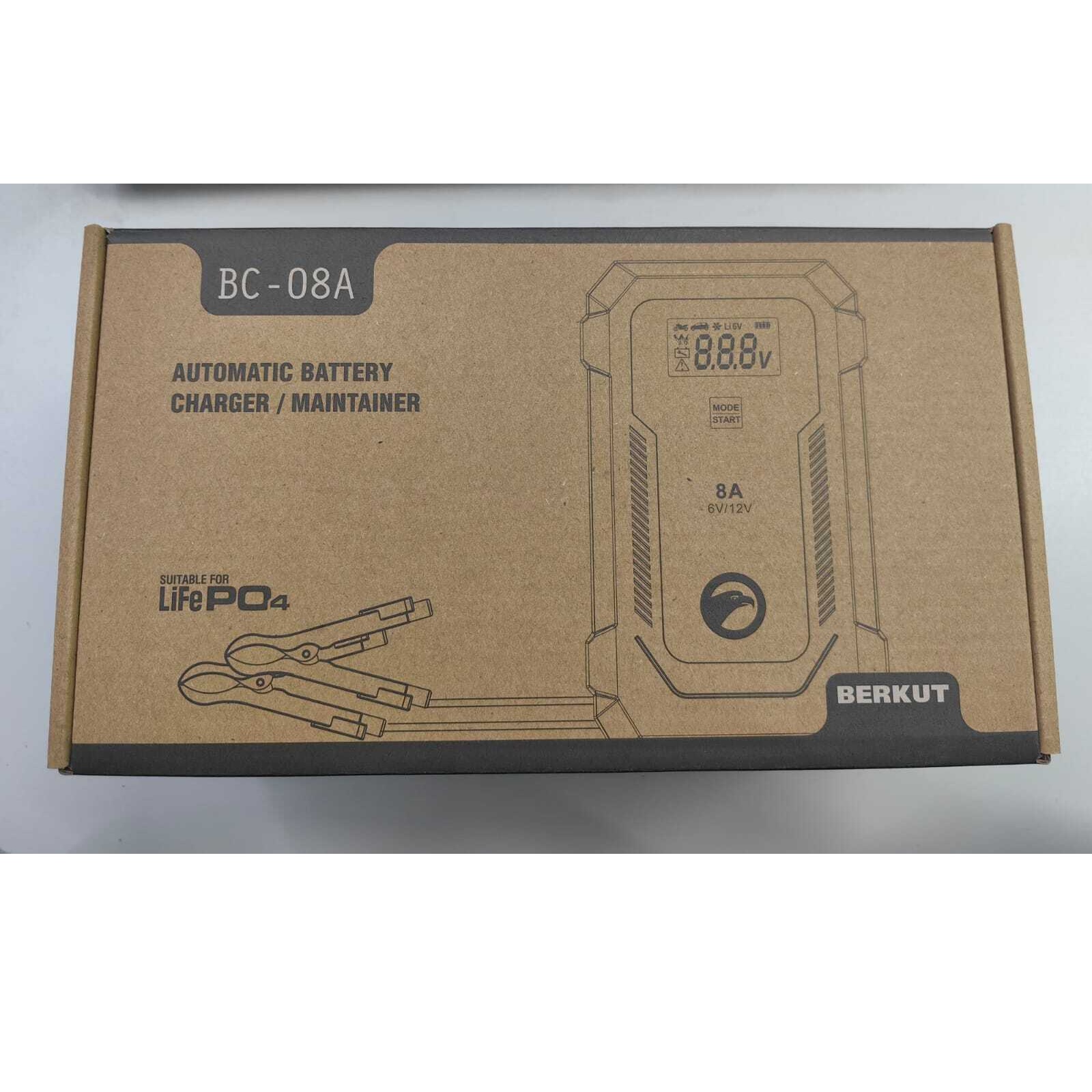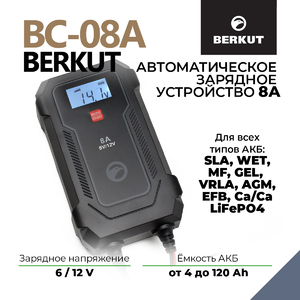 Зарядное устройство BERKUT BC-08A — полностью автоматическое устройство, предназначенное для обслуживания и зарядки 6 и 12-Вольтовых аккумуляторных батарей емкостью от 4 до 120 Ач, используемых в мото- и садовой техники и т.п. Устройство является полностью автоматическим и имеет поэтапный поэтапным алгоритмом зарядки в 9 стадий.