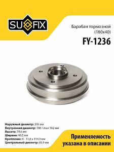 Барабан тормозной (180x40) SUFIX FY-1236. Применение: CHEVROLET Matiz 05> / Spark 00>, DAEWOO Matiz 98>.