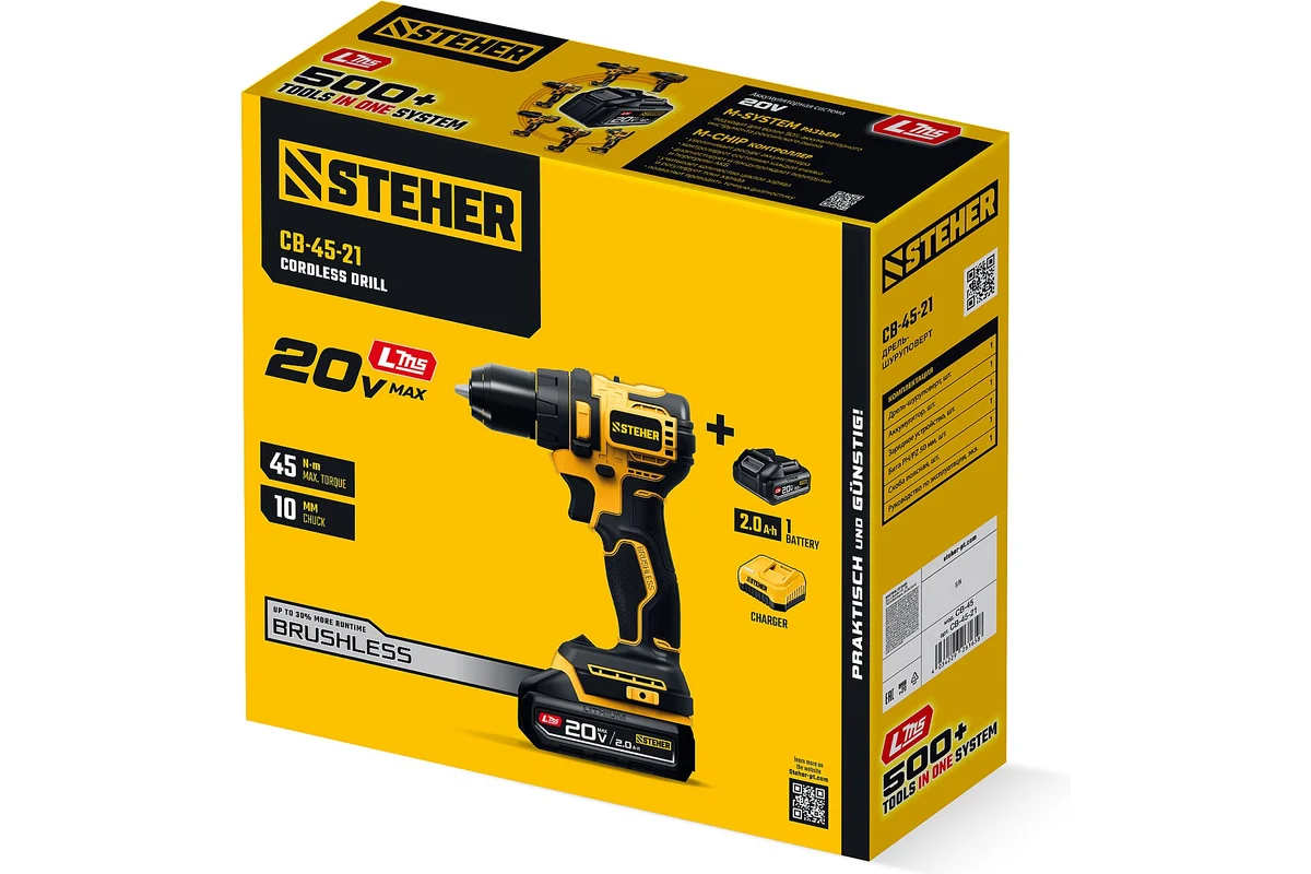 Бесщеточная дрель-шуруповерт STEHER 20 В, 45 Н·м, 1 АКБ LMS (2 А·ч), (CB-45-21)