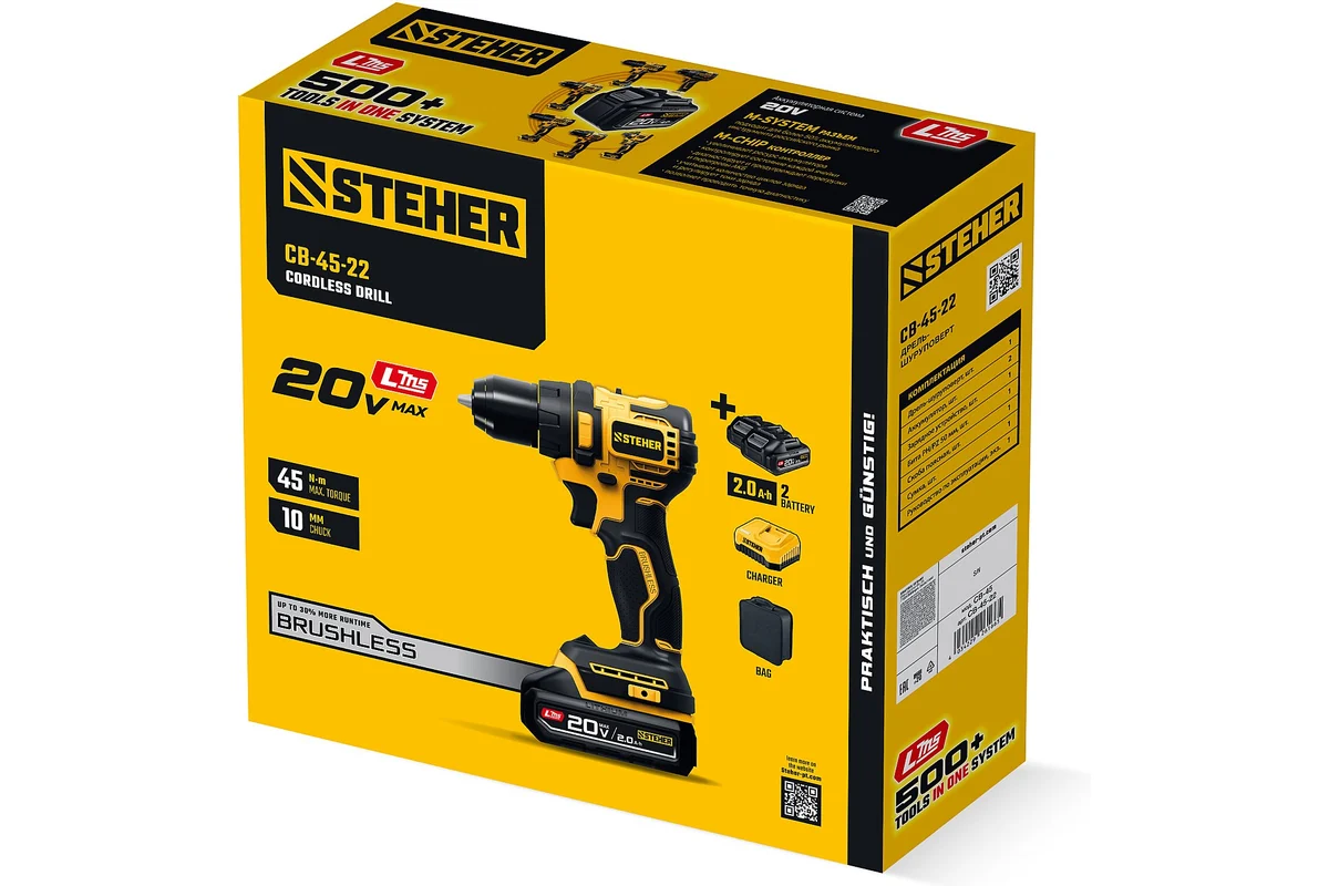 Бесщеточная дрель-шуруповерт STEHER 20 В, 45 Н·м, 2 АКБ LMS (2 А·ч), сумка (CB-45-22)