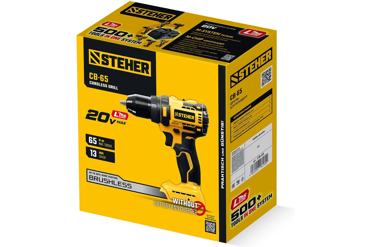 Бесщеточная дрель-шуруповерт STEHER 20 В, 65 Н·м, без АКБ (LMS), (CB-65)