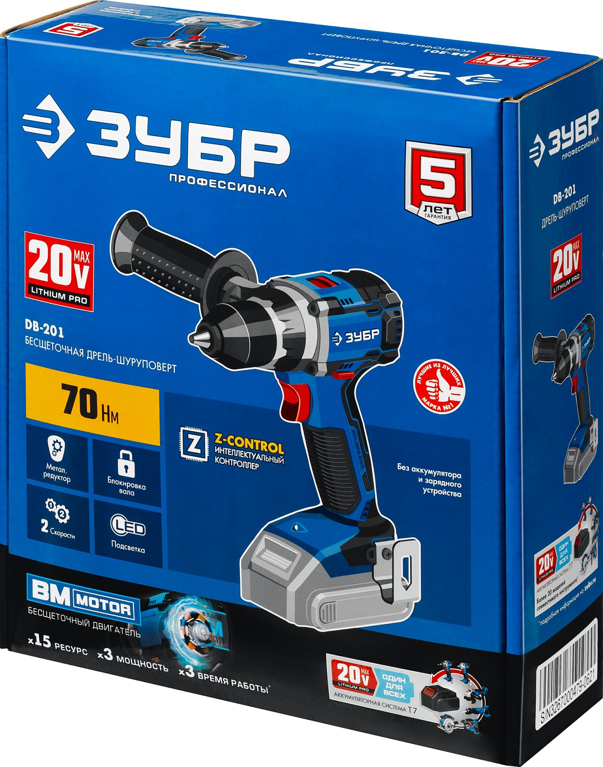 Бесщеточная дрель-шуруповерт ЗУБР Т7, 20 В, 70 Н·м, без АКБ, Профессионал (DB-201)