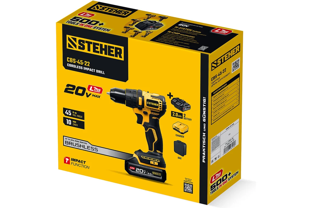Бесщеточная ударная дрель-шуруповерт STEHER 20 В, 45 Н·м, 2 АКБ LMS (2 А·ч), сумка (CBS-45-22)