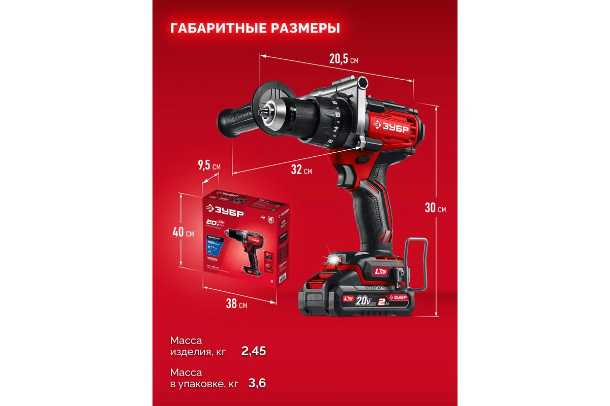 ЗУБР 20 В, 165 Н·м, 1 АКБ LMS (2 А·ч), бесщеточная ударная дрель-шуруповерт ДБУ-165-21 - бесщеточная ударная дрель-шуруповерт ЗУБР системы LMS с увеличенным крутящим моментом предназначена для быстрого заворачивания саморезов до 12 мм диаметром и сверления отверстий до 40 мм в дереве. Длительная работа от одного заряда обеспечивается эффективным двигателем BRUSHLESS. Расширенная функциональность за счет ударного режима работы. Комплектация с аккумулятором позволяет начать работу сразу после покупки.