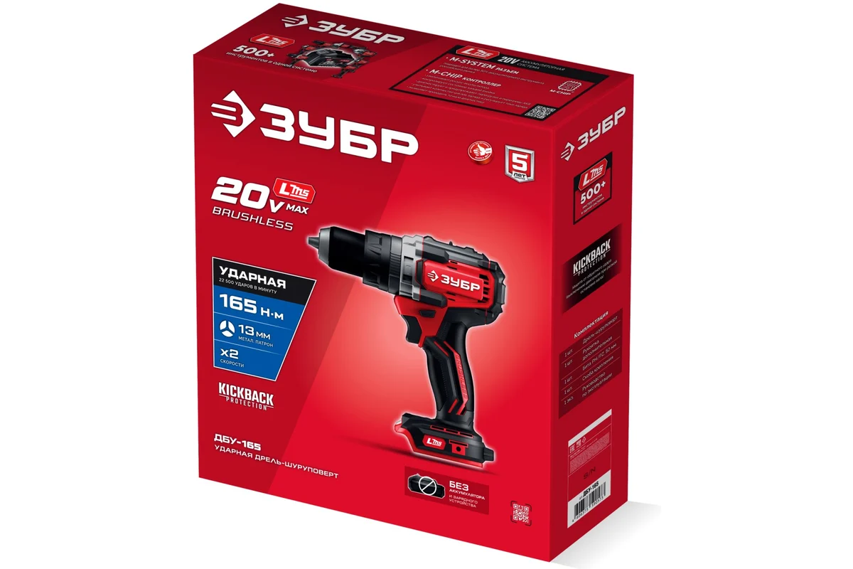 ЗУБР 20 В, 165 Н·м, без АКБ (LMS), бесщеточная ударная дрель-шуруповерт ДБУ-165 - бесщеточная ударная дрель-шуруповерт ЗУБР системы LMS с максимальным крутящим моментом 165 Нм предназначена для работы с самым крупным крепежом (саморезы до 12 мм диаметром) и сверления отверстий до 40 мм в дереве. Встроенная защита от обратного удара предотвращает повреждение кисти при резкой блокировке вала. Расширенная функциональность за счет ударного режима работы.