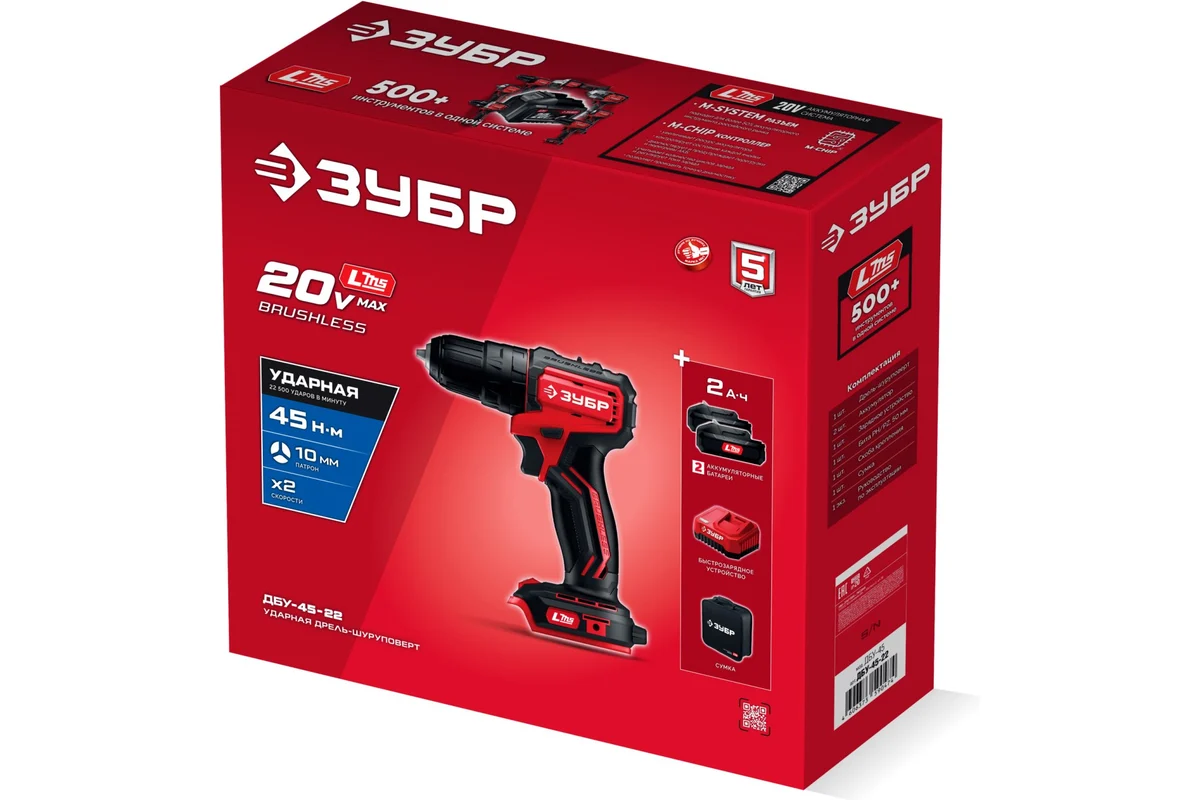 Бесщеточная ударная дрель-шуруповерт ЗУБР 20 В, 45 Н·м, 2 АКБ LMS (2 А·ч), сумка (ДБУ-45-22)