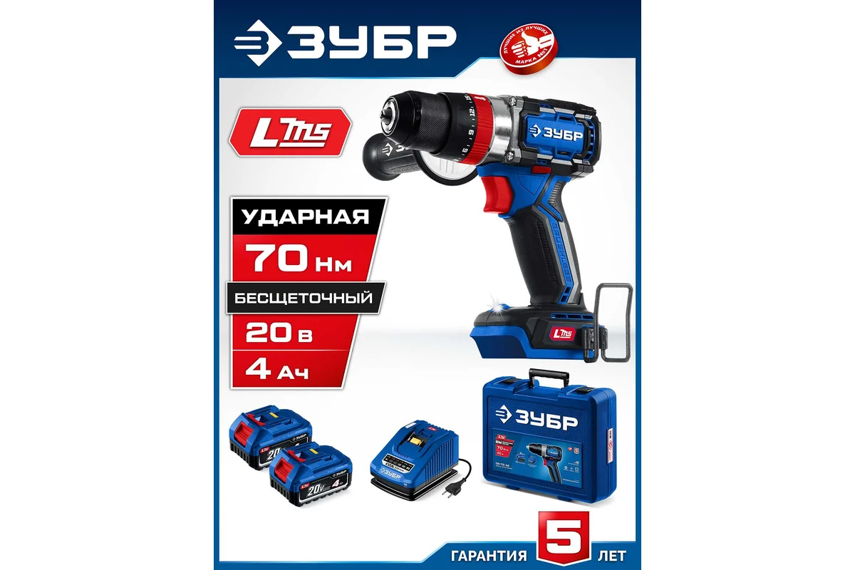 ЗУБР Профессионал 20 В, 70 Н·м, 2 АКБ LMS (4 А·ч), бесщеточная ударная дрель-шуруповерт, кейс DBS-70-42 - высокотехнологичная модель в новой линейке аккумуляторного инструмента ЗУБР серии LMS.