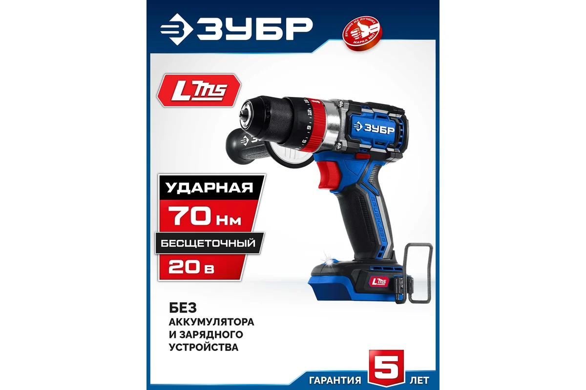 ЗУБР Профессионал 20 В, 70 Н·м, без АКБ (LMS), бесщеточная ударная дрель-шуруповерт DBS-70 - высокотехнологичная модель в новой линейке аккумуляторного инструмента ЗУБР серии LMS.