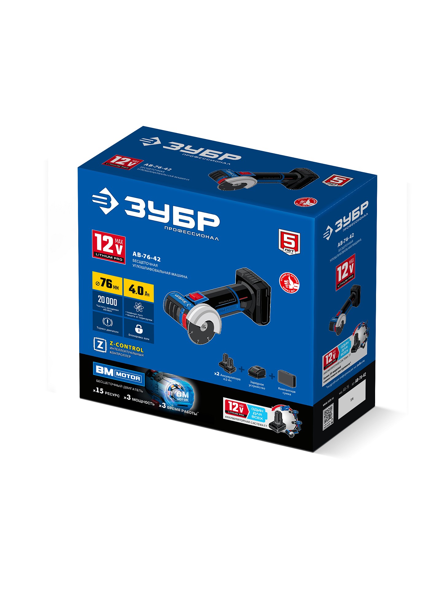 Бесщеточная УШМ ЗУБР 12 В, D76 мм, 2 АКБ тип Т7 (4 А·ч), сумка, Профессионал (AB-76-42)