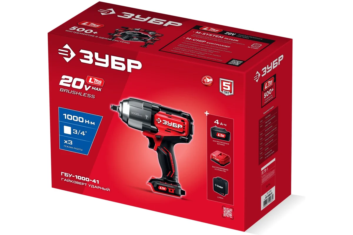 Бесщеточный ударный гайковерт ЗУБР 20 В, 1000 Н·м, 1 АКБ LMS (4 А·ч), сумка (ГБУ-1000-41)