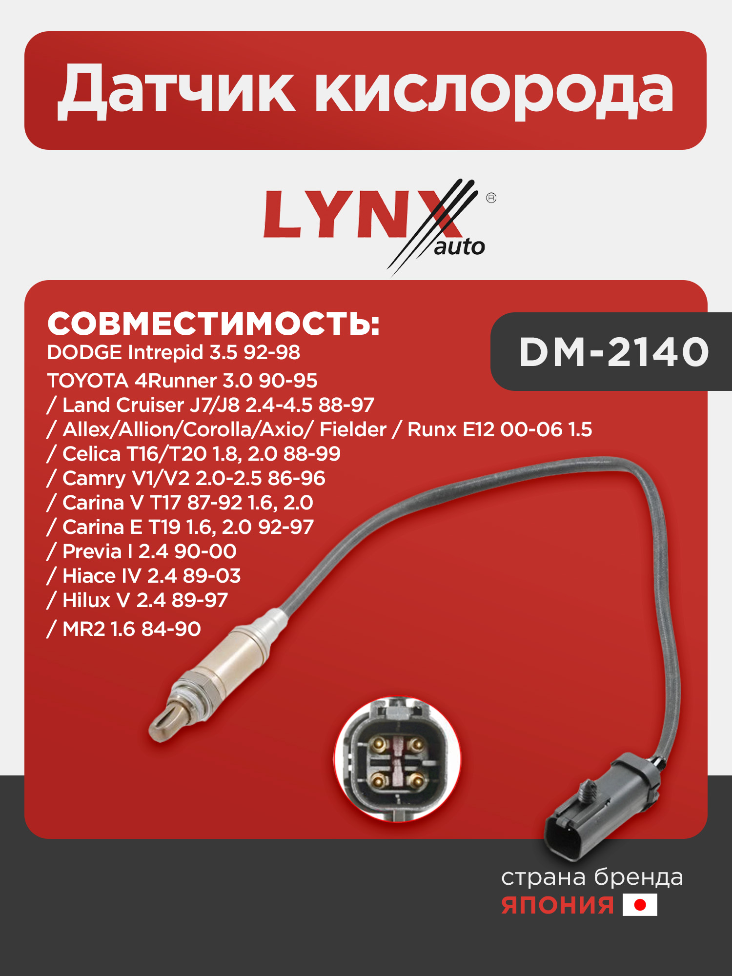 Датчик кислорода LYNXauto DM-2140. Для DODGE Intrepid 3.5 92-98, TOYOTA 4Runner 3.0 90-95 / Allex / Allion / Corolla / Axio / Fielder / Runx E12 00-06 1.5 / Camry V1 / V2 2.0-2.5 86-96 / Carina V T17 87-92 1.6, 2.0 / Carina E T19 1.6, 2.0 92-97 / Celica T