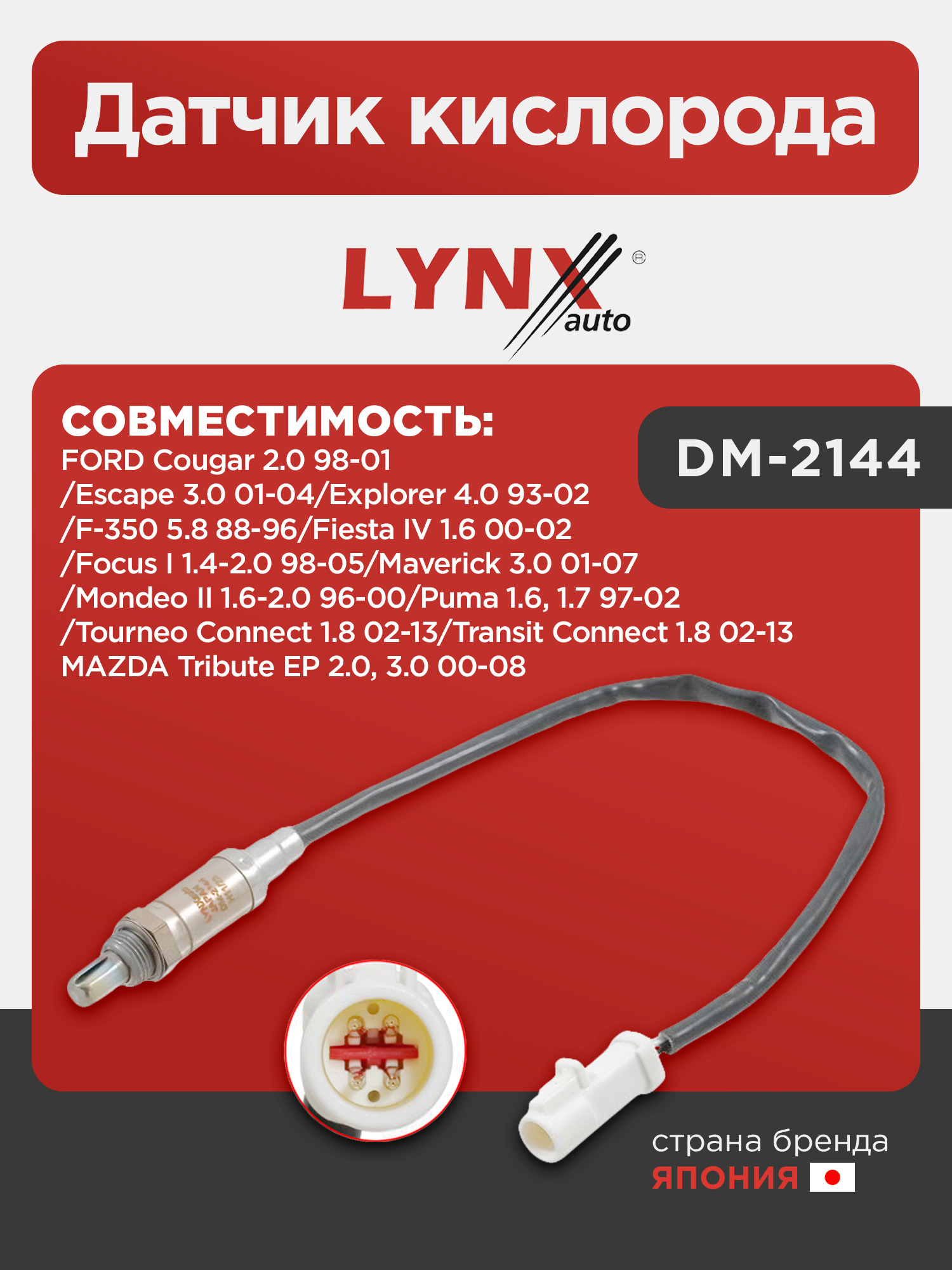 Датчик кислорода LYNXauto DM-2144. Для FORD ФОРД Cougar 2.0 98-01/Escape 3.0 01-04/Explorer 4.0 93-02/F-350 5.8 88-96/Fiesta IV 1.6 00-02/Focus(Фокус) I 1.4-2.0 98-05/Maverick 3.0 01-07/Mondeo(Мондео) II 1.6-2.0 96-00/Puma 1.6, 1.7 97-02/Tourneo Connect 1.8 02-13/Transit(Транзит) Connect 1.8 02-13, MAZDA Мазда Tribute EP 2.0, 3.0 00-08
