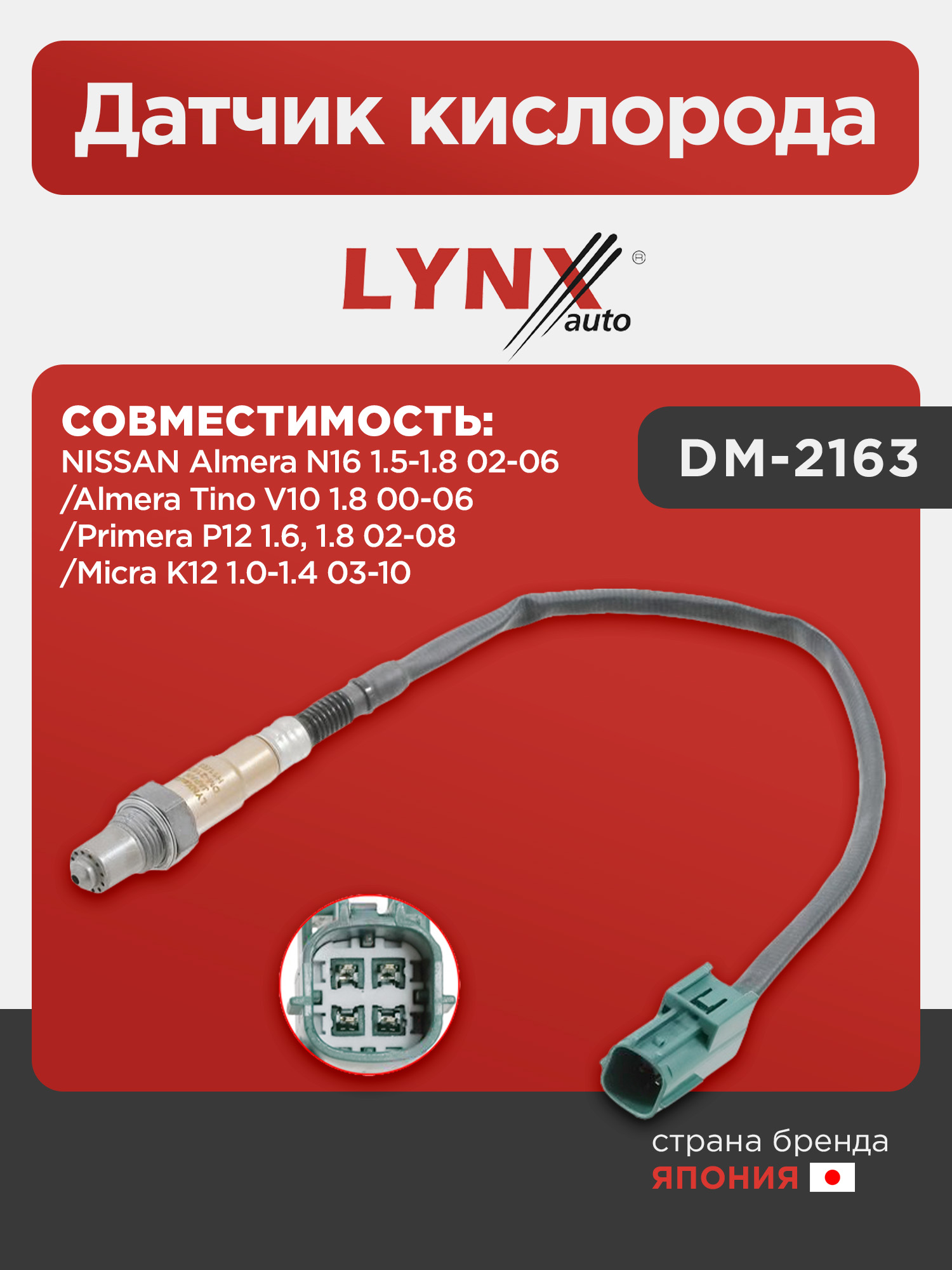 Датчик кислорода LYNXauto DM-2163. Для NISSAN Ниссан Almera(Алмера) N16 1.5-1.8 02-06/Almera(Алмера) Tino V10 1.8 00-06/Micra(Микра) K12 1.0-1.4 03-10/Primera(Примера) P12 1.6, 1.8 02-08