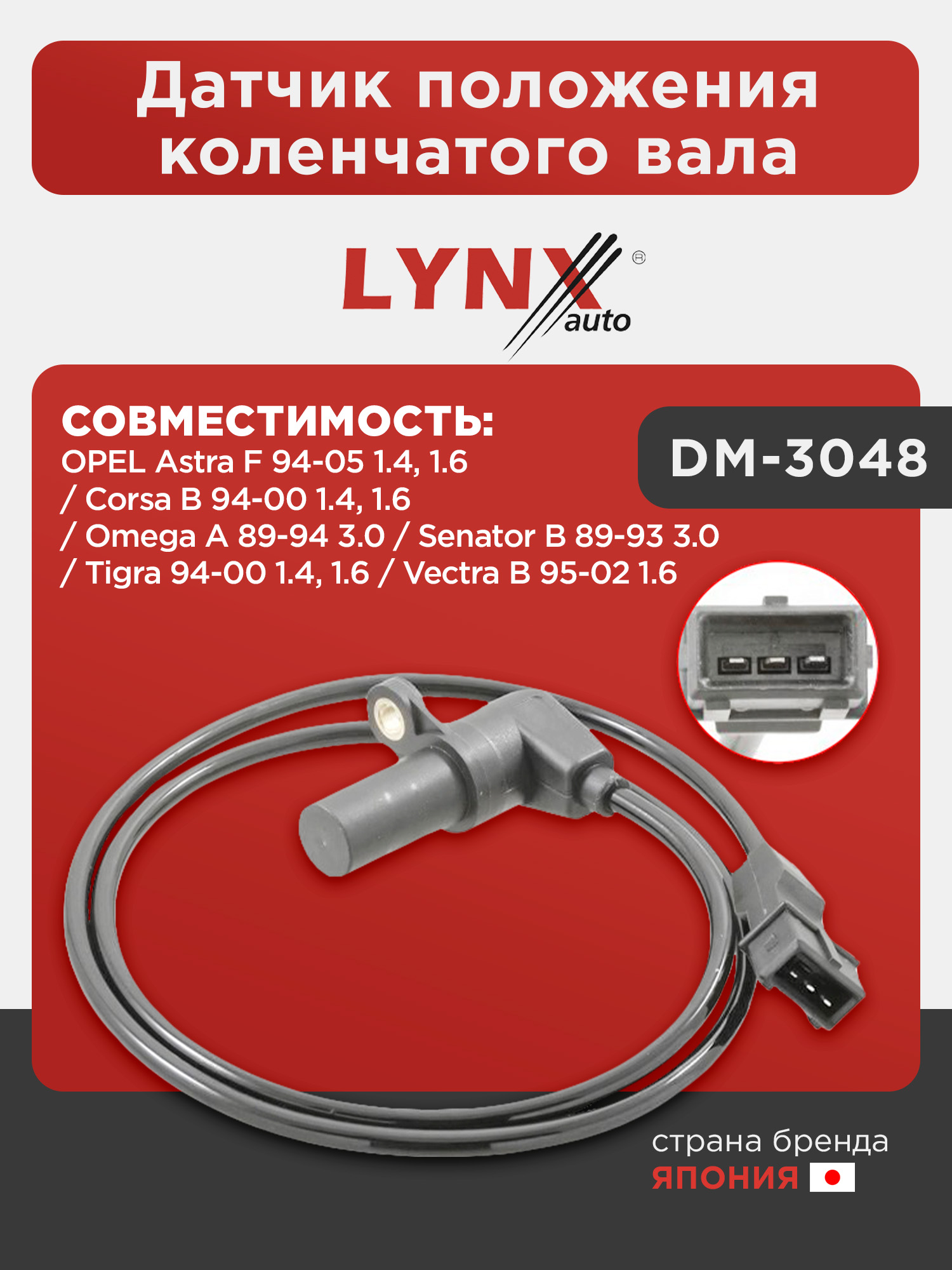 Датчик положения коленчатого вала LYNXauto DM-3048. Для OPEL Astra F 94-05 1.4, 1.6 / Corsa B 94-00 1.4, 1.6 / Omega A 89-94 3.0 / Senator B 89-93 3.0 / Tigra 94-00 1.4, 1.6 / Vectra B 95-02 1.6
