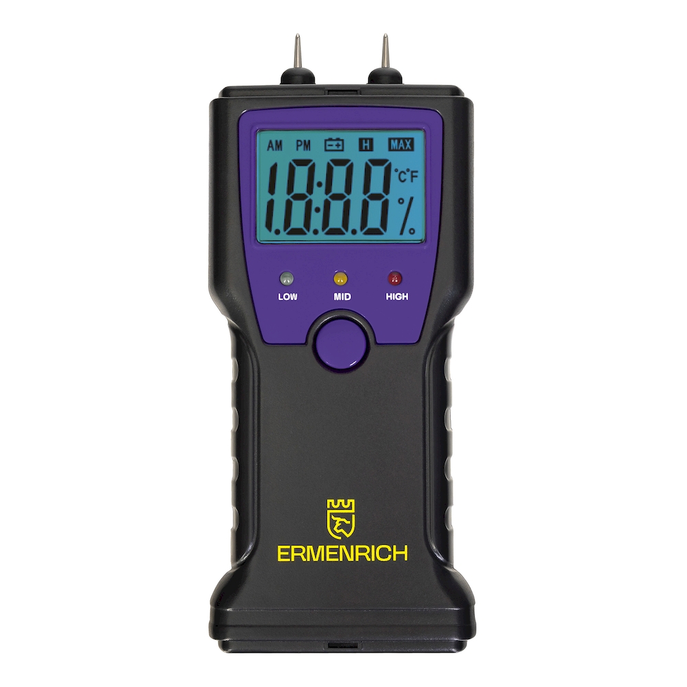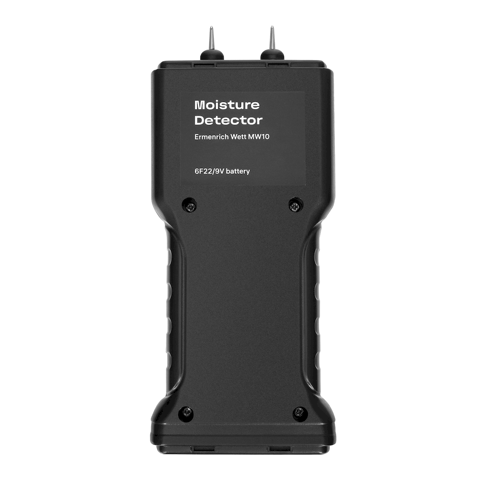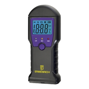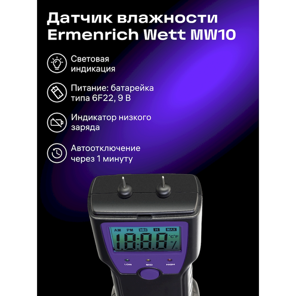 Влагомер Ermenrich Wett MW10 — это портативный и простой в использовании прибор для измерения влажности и температуры таких материалов, как древесина (пиломатериалы, бумага, картон), а также строительные смеси — цементный раствор, бетон, гипс, известняк и другие. Принцип работы основан на игольчатых сенсорах, обеспечивающих практически мгновенный отклик. Перед началом измерений необходимо выбрать соответствующий режим: для древесины или для строительных материалов. Результаты отображаются на компактном ЖК-экране с яркой голубой подсветкой: влажность — в процентах, температура — в градусах Цельсия или Фаренгейта (по выбору). Для быстрой визуальной оценки уровня влажности предусмотрена цветовая индикация: зелёный светодиод сигнализирует о низком уровне, жёлтый — о среднем, красный — о высоком. Погрешность измерений не превышает ±2% для древесины и ±0,1% для строительных материалов; точность термометра — ±2 °C. Прибор питается от стандартной батарейки «Крона» (6F22, 9 В), оснащён функцией автоотключения через 1 минуту бездействия и индикатором низкого заряда на дисплее. Управление осуществляется всего одной кнопкой, что делает устройство интуитивно понятным даже при первом использовании.