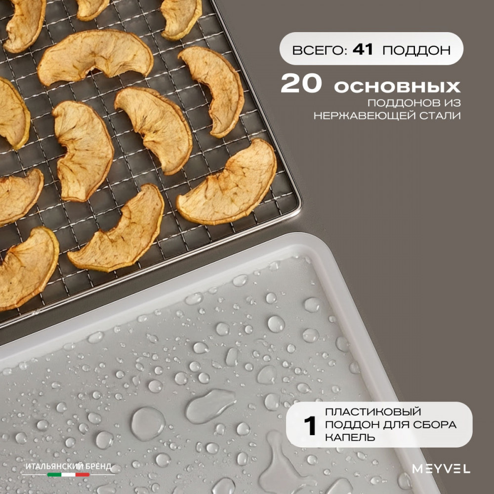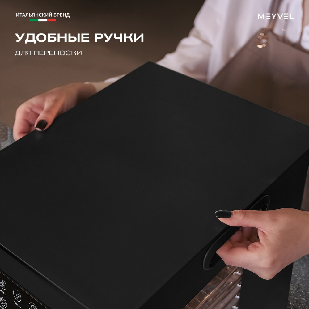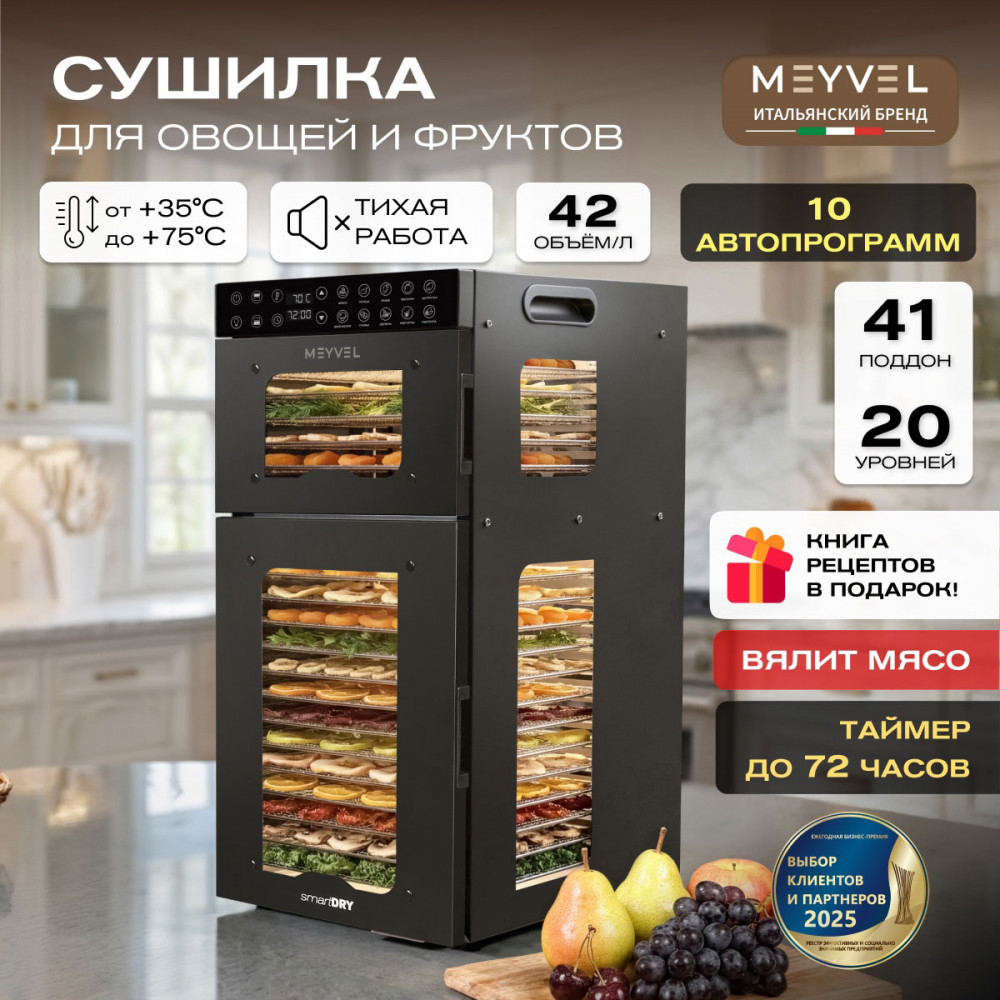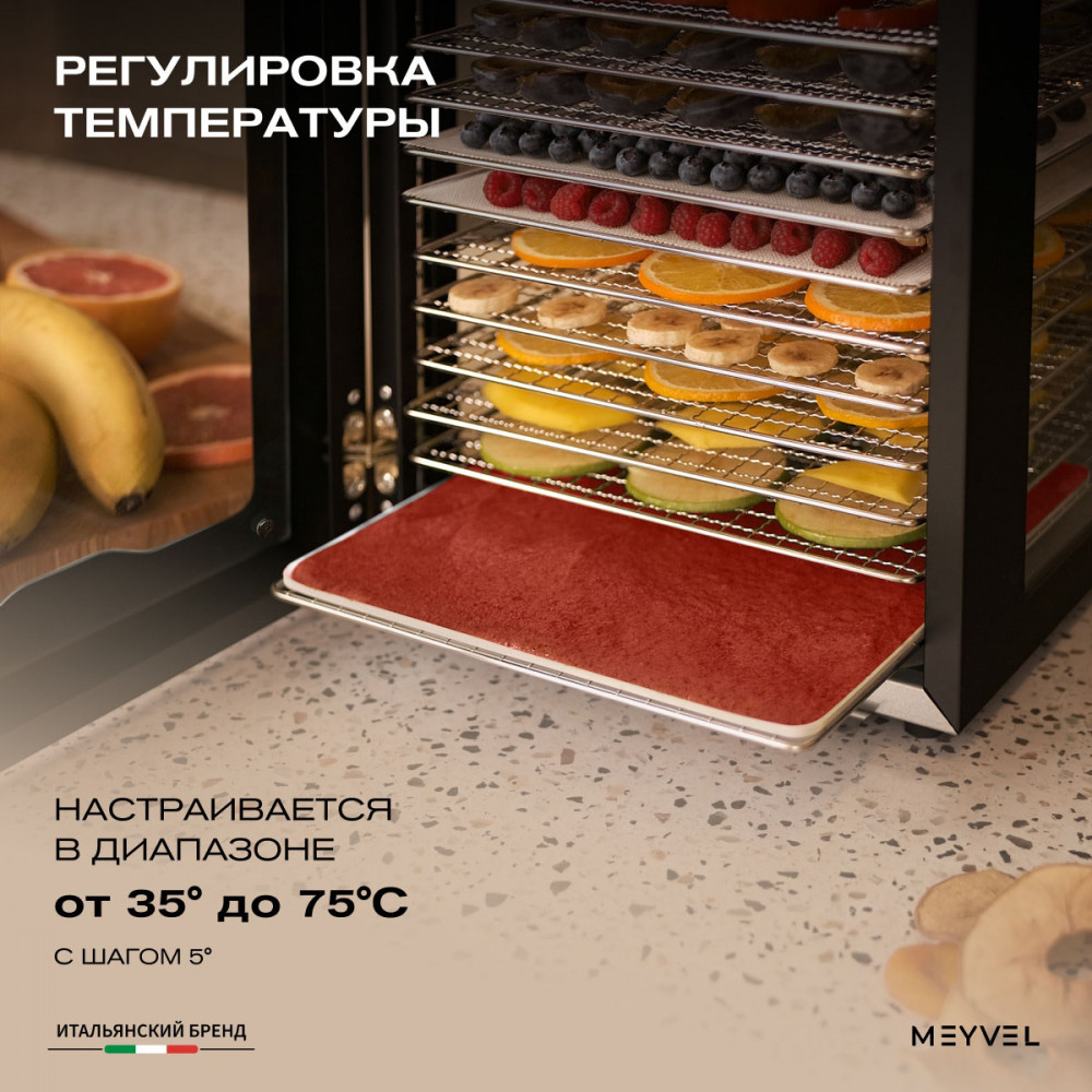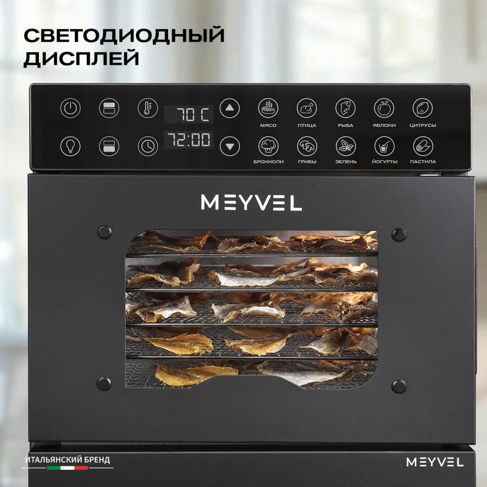 Meyvel MDH20-1S2 (Чёрный) (Black) — это современный дегидратор, который создан для тех, кто хочет заготавливать фрукты, овощи, мясо, травы и ягоды без потери их вкуса и пользы круглый год. Прочный корпус, продуманная конструкция и умная электроника превращают его в надёжного помощника на каждый сезон.