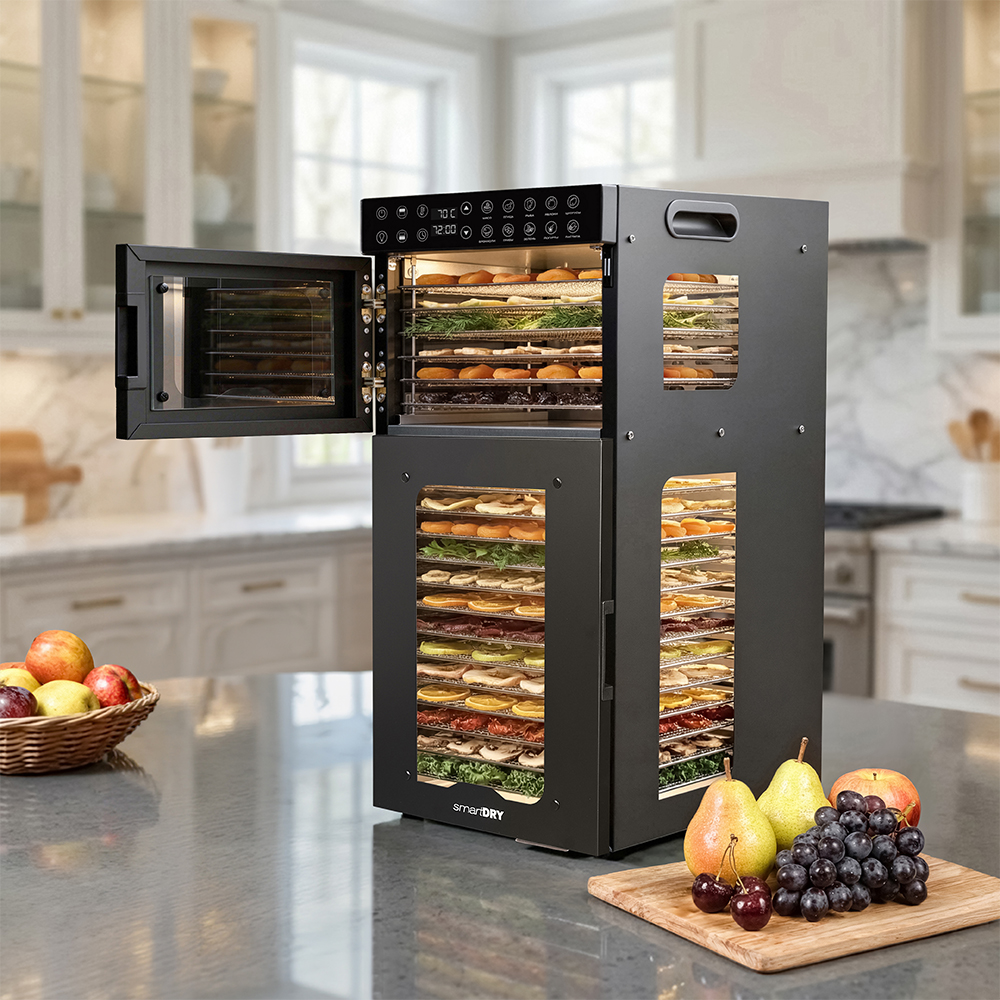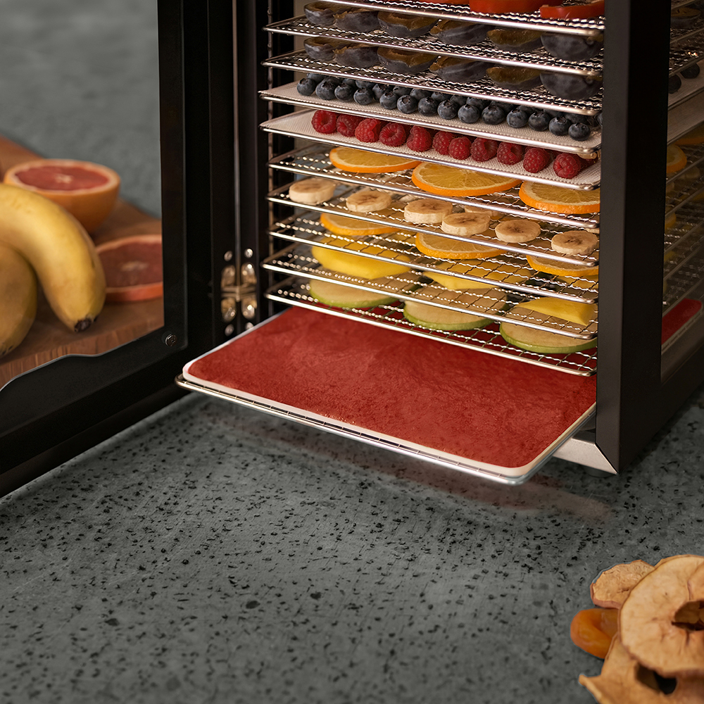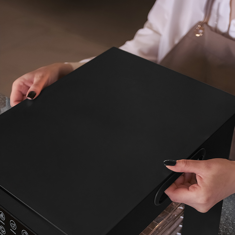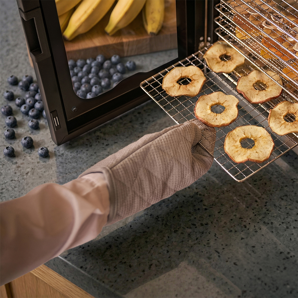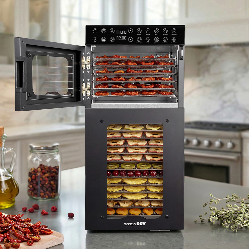 Чёрный корпус из нержавеющей стали, устойчивый к нагреву, влаге и коррозии, выглядит лаконично и современно, легко вписывается в интерьер кухни или мастерской. Внутри установлено 20 поддонов из нержавеющей стали с зазором 25 мм — этого достаточно, чтобы удобно размещать ломтики фруктов, травы или мясные полоски. В комплект также входят: