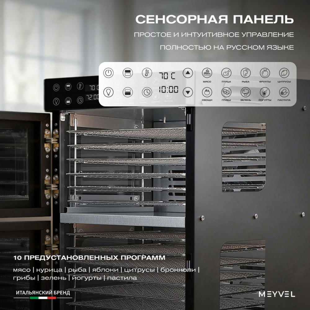Дегидратор оснащён сенсорной панелью, которая значительно упрощает процесс настройки. Никаких механических рычагов и лишних кнопок — всё управление сосредоточено в одном месте.