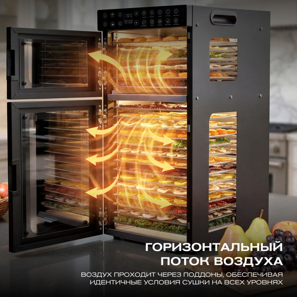 Этот дегидратор оснащён двумя отдельными зонами сушки, в каждой из которых можно установить отдельный режим. Вы можете одновременно готовить разные продукты, задавая для каждой камеры свои параметры температуры и времени. Главное, разница температур между зонами не должна превышать 25°C.