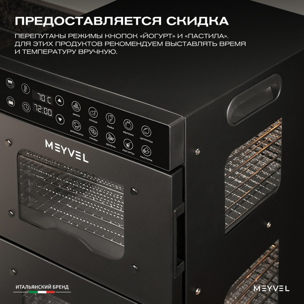 На товар предоставляется скидка: перепутаны режимы кнопок «Йогурт» и «Пастила». Для этих продуктов рекомендуем выставлять время и температуру вручную.