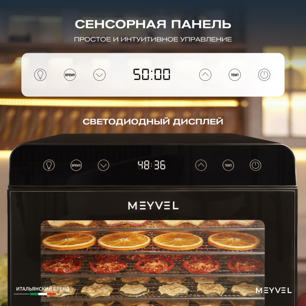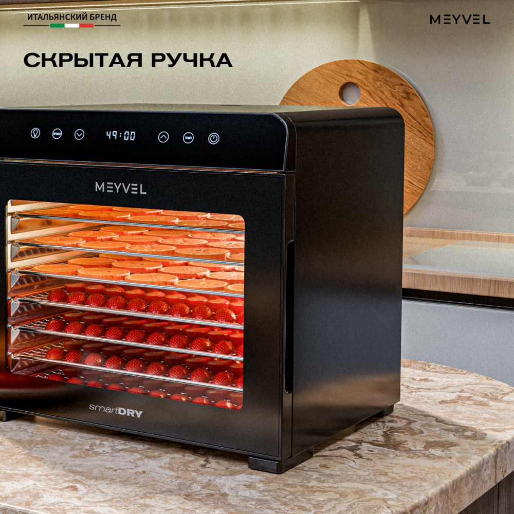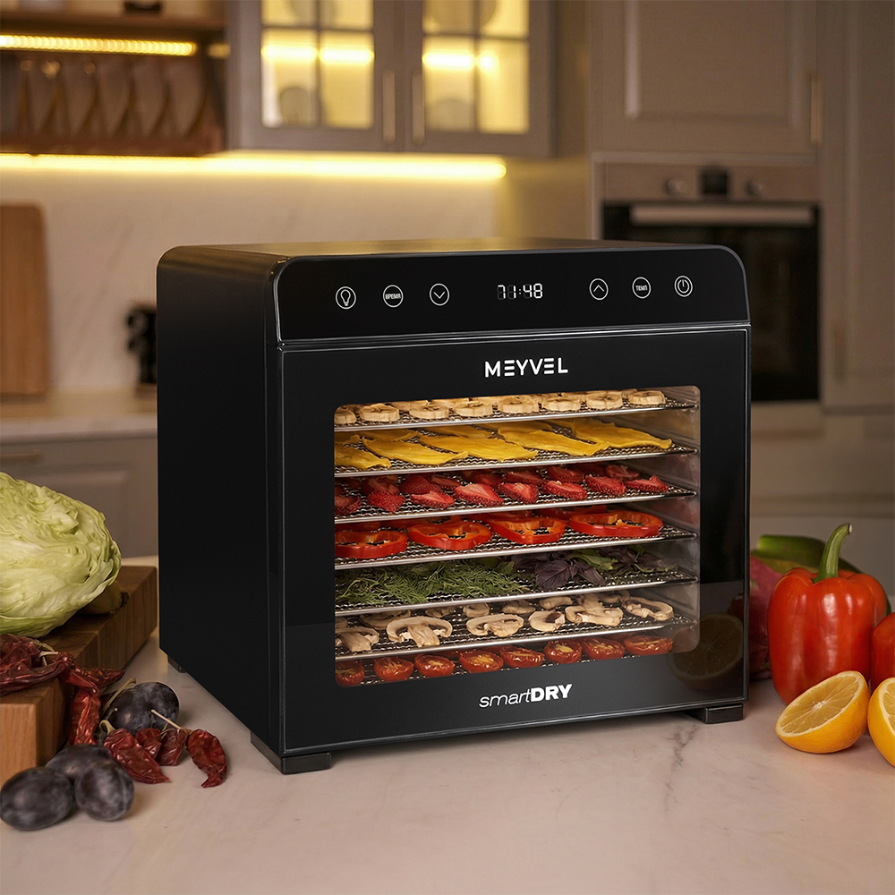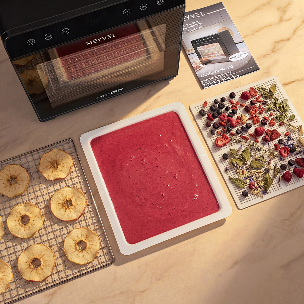 Дегидратор Meyvel MDH8-2S (Чёрный) (Black) подойдёт тем, кто хочет питаться натуральной и разнообразной едой без лишнего сахара и консервантов. С его помощью легко приготовить домашние снеки, пастилу, сушёные фрукты или ароматные травы. Всё с сохранением вкуса, пользы и аппетитного вида.