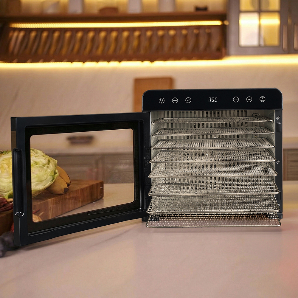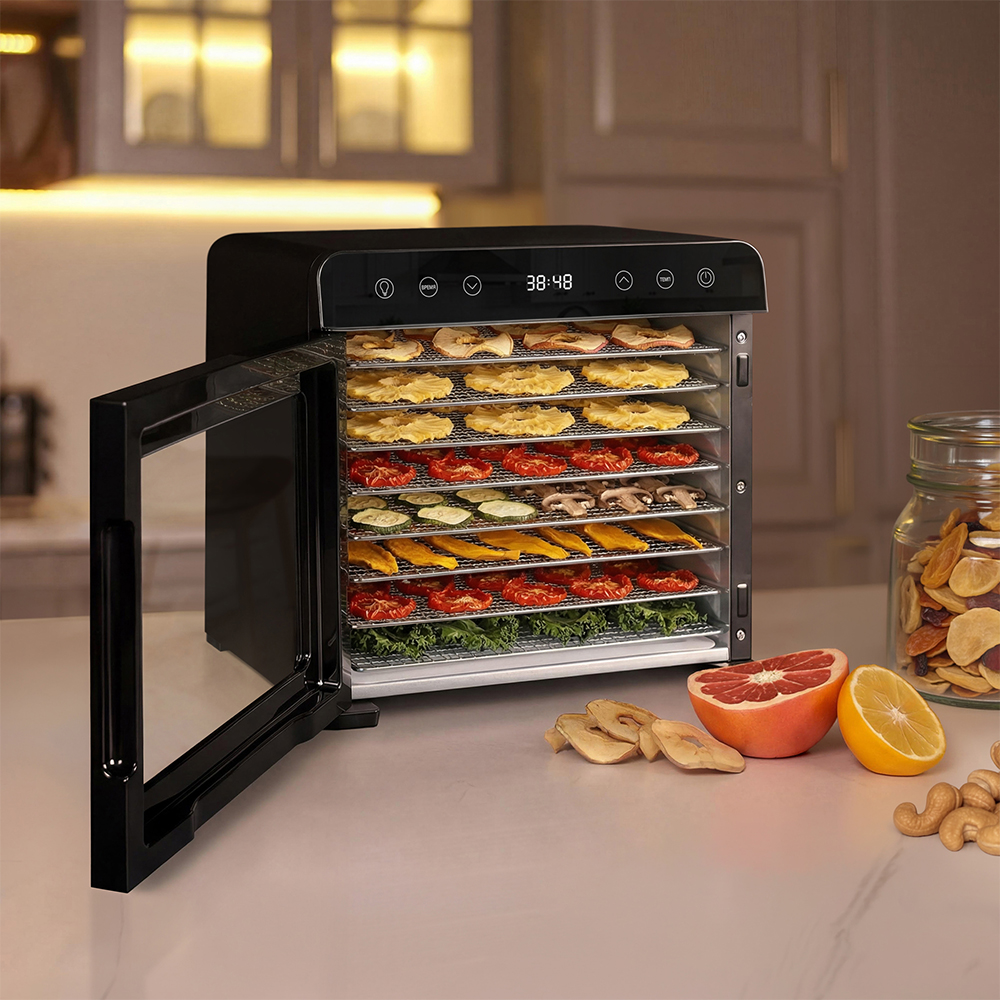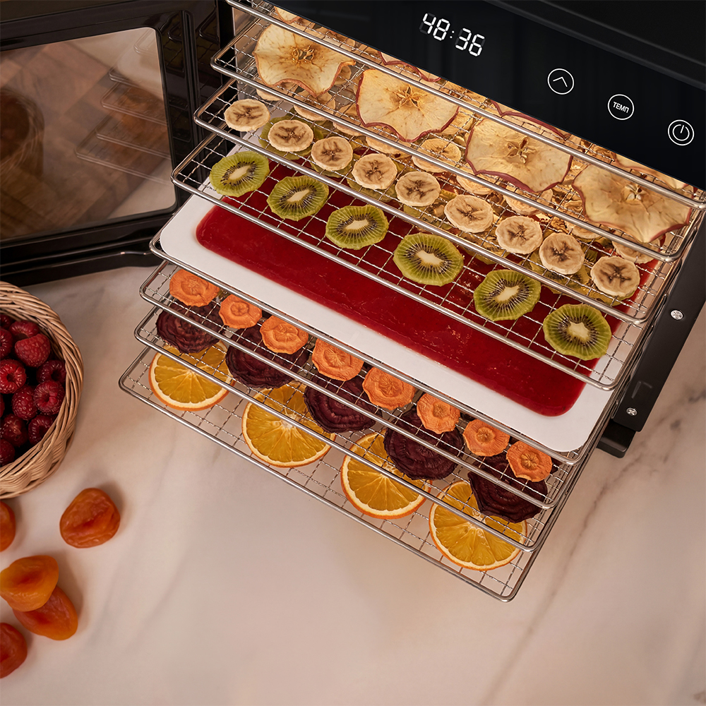Настройка максимально проста: достаточно выбрать температуру и время на сенсорной панели, остальное дегидратор сделает сам. Таймер рассчитан на работу до 72 часов без перерывов, можно спокойно оставить дегидратор надолго, не переживая за результат. Устройство отлично справляется и с крупными партиями яблок или грибов, и с деликатными травами.