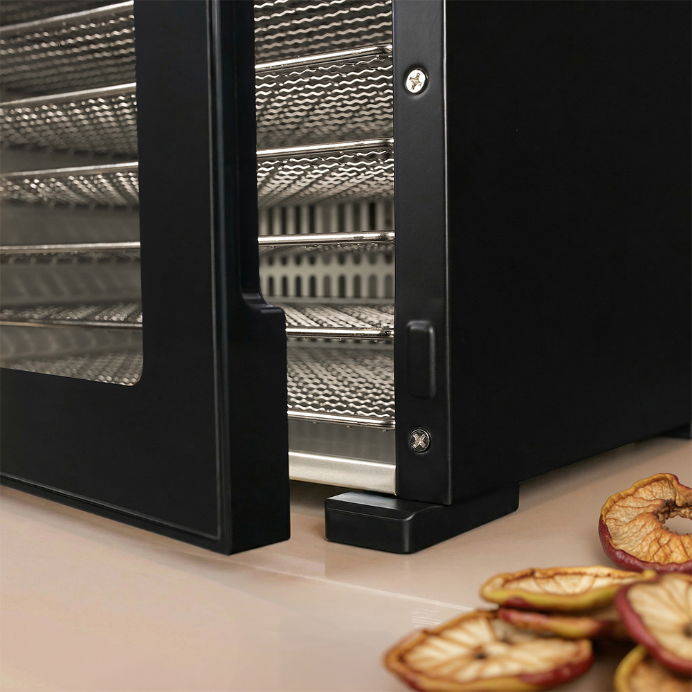 Чёрный металлический корпус выглядит элегантно, гармонично вписывается в современный интерьер и не требует особого ухода. Он устойчив к царапинам и механическим воздействиям, а сам дегидратор компактный, но вместительный.