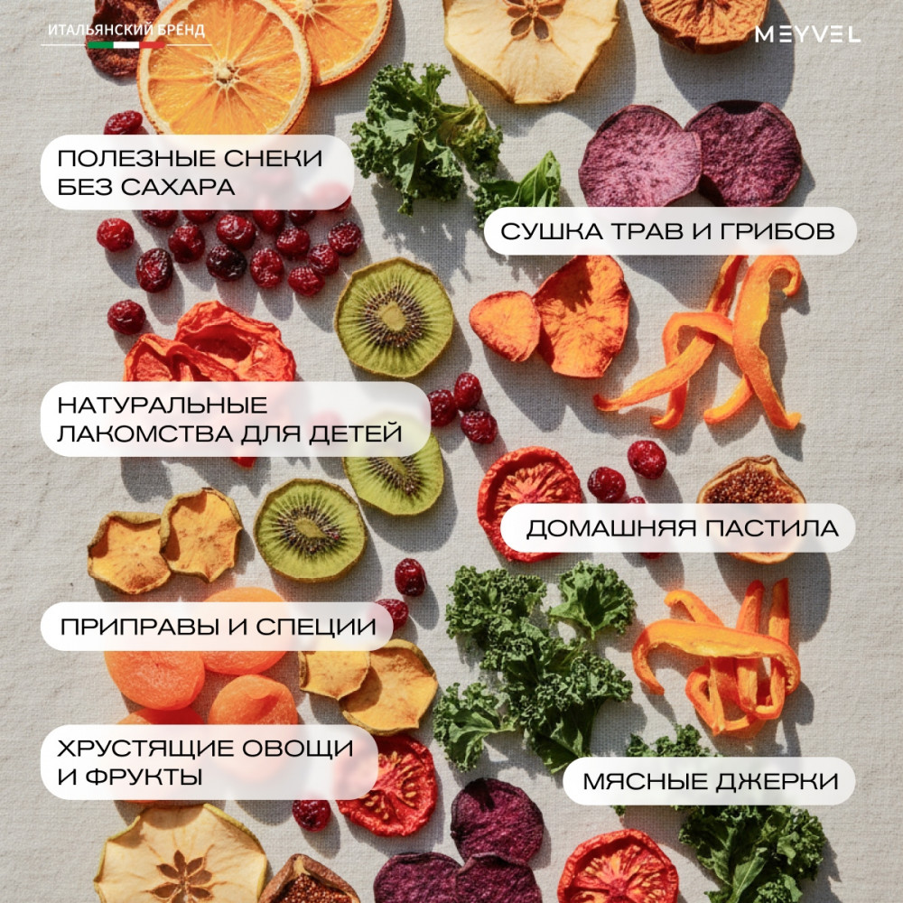 Сушка — это деликатный способ заготовки, при котором продукты не теряют цвет, вкус и витамины. В Meyvel MDH8-2S (Чёрный) (Black) можно выставлять температуру от 35 до 80°C, подбирая подходящий режим для каждого ингредиента, например, ломтиков яблок, свёклы или мяса.