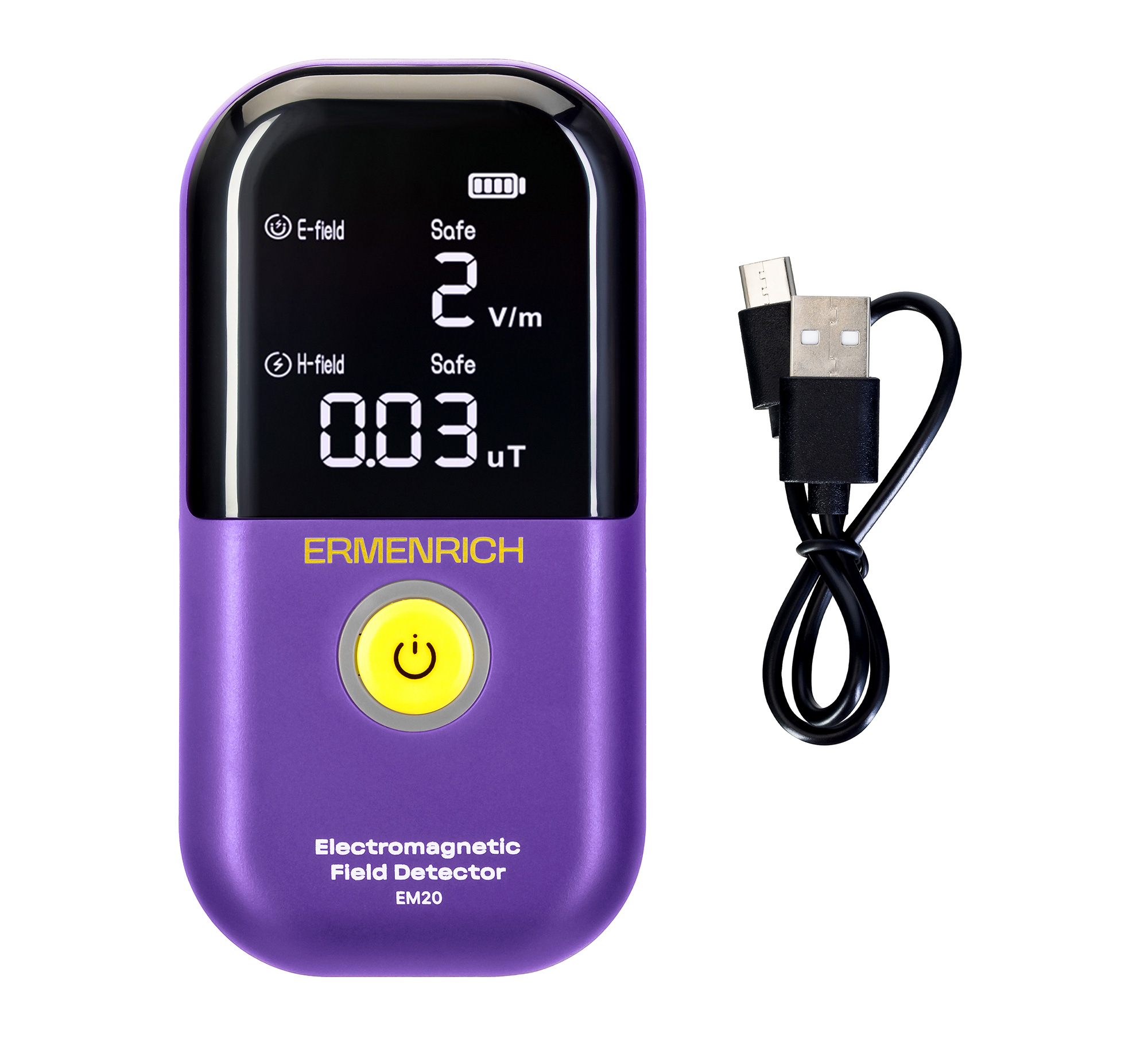 Детектор ЭМП Ermenrich EM20 питается от встроенного литий-ионного аккумулятора 700 мАч, 3,7 В. Для его полной зарядки потребуется всего 1,5 часа, при этом время автономной работы после этого составит целых 20 часов. Срок службы датчика – не менее 2–3 лет в зависимости от интенсивности и частоты эксплуатации. Корпус прибора изготовлен из высокопрочного ABS-пластика инженерного класса, устойчивого к ударам, царапинам и истиранию.