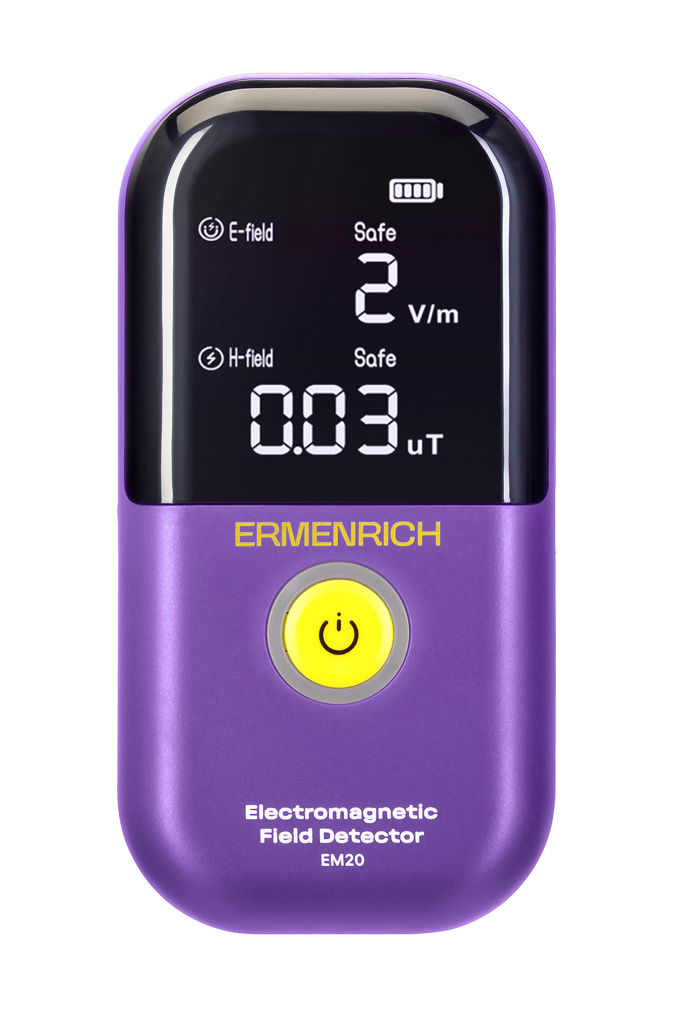 Детектор Ermenrich EM20 проводит одновременный замер параметров электрического и магнитного полей после нажатия на кнопку на корпусе. Диапазон определения напряженности электрического поля – 1–1999 В/м (вольт на метр), магнитной индукции – 0,01–99,99 µT (микротеслы). Погрешность для каждого из значений составляет 1 В/м и 0,01 µT соответственно – совсем незначительное отклонение, которое не окажет существенного влияния на правдоподобность результатов. Время выборки прибора (сбора информации) равно <0,5 секунды, а через <2 секунды итоги тестирования уже отобразятся на ярком, легко читаемом LED-экране. Более того, рядом с измеренным значением появится уведомление «Safe» (если интенсивность соответствует нормам) или «Harmful» (если интенсивность превышает допустимые значения). Для удобства пользователя детектор оснащен звуковой и визуальной сигнализацией, которая срабатывает при пересечении запрограммированных максимальных показателей – 40 В/м для электрического поля и 0,4 µT для магнитного. В случае, когда на экране не отображается никакого значения, это говорит о том, что интенсивность излучения находится вне пределов пропускной способности прибора.