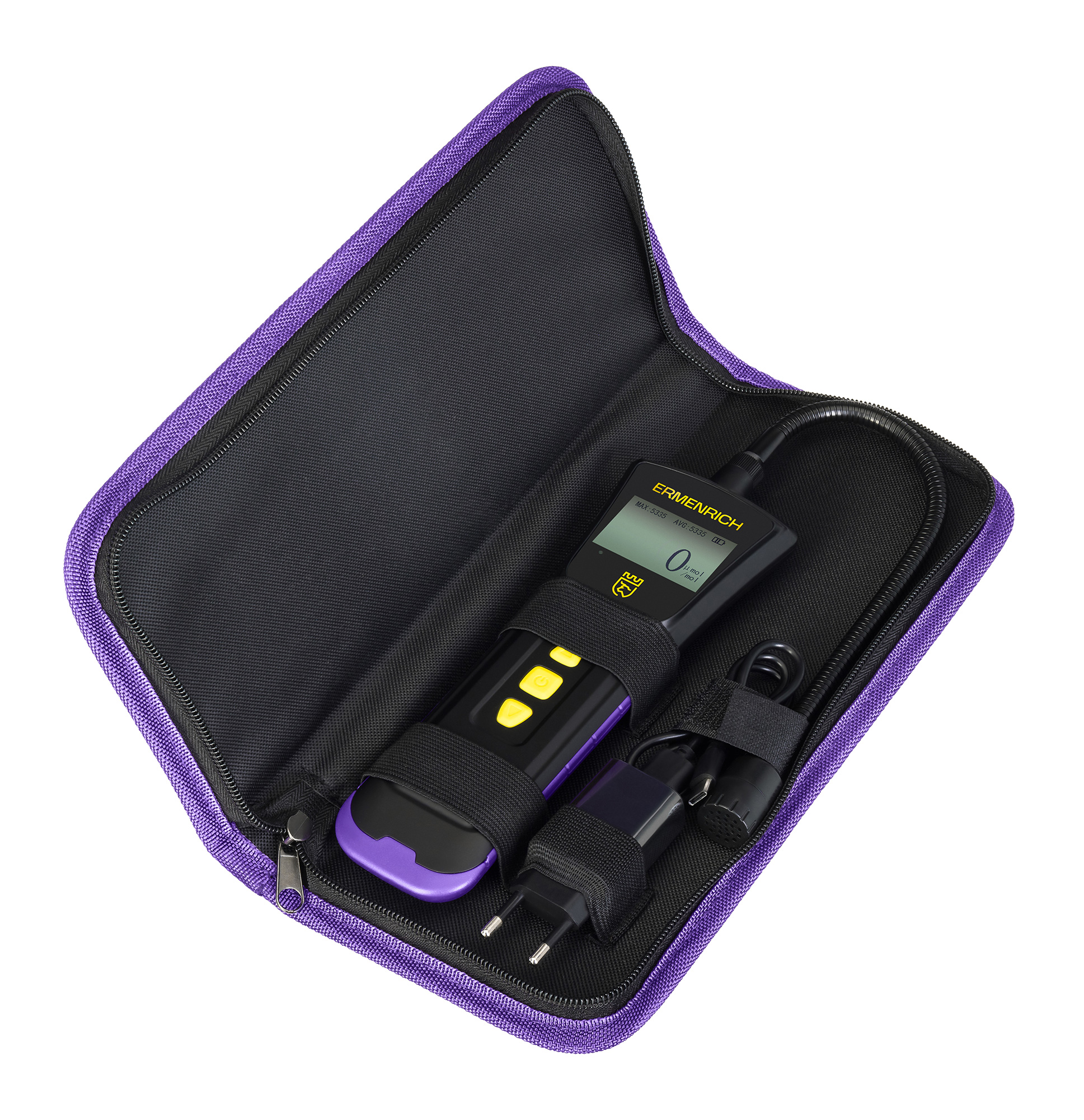Конструкция прибора имеет защиту не только от проникновения воды и пыли, но также и от взрыва. Прибор поставляется с кабелем для зарядки и сетевым адаптером, все помещено в прочный алюминиевый кейс.