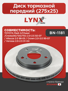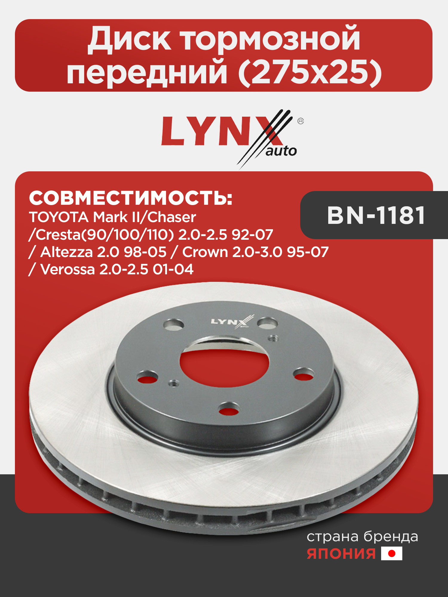 Диск тормозной передний (275x25) LYNXauto BN-1181. Для TOYOTA Mark II/Chaser/Cresta(90/100/110) 2.0-2.5 92-07 / Altezza 2.0 98-05 / Crown 2.0-3.0 95-07 / Verossa 2.0-2.5 01-04