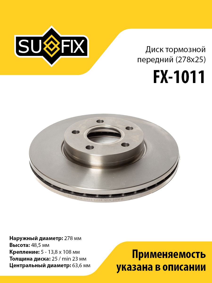 Диск тормозной передний (278x25) SUFIX FX-1011. Применение: FORD Focus II 1.4-2.0D 04-12 / C-Max 1.6-2.0D 03-10, VOLVO C30 1.6-2.5 06-12 / S40 II 1.6-2.5 04-12.