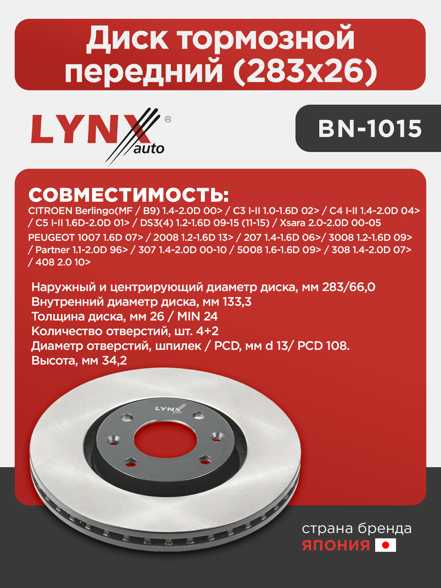 Диск тормозной передний (283x26) LYNXauto BN-1015. Применение: CITROEN Berlingo(MF / B9) 1.4-2.0D 00> / C3 I-II 1.0-1.6D 02> / C4 I-II 1.4-2.0D 04> / C5 I-II 1.6D-2.0D 01> / DS3 1.2-1.6D 09-15 / DS4 1.2-1.6D 11-15 / Xsara 2.0-2.0D 00-05, PEUGEOT 1007 1.6D 07> / 2008 1.2-1.6D 13> / 207 1.4-1.6D 06> / 3008 1.2-1.6D 09> / 307 1.4-2.0D 00-10 / 308 1.4-2.0D 07> / 408 2.0 10> / 5008 1.6-1.6D 09> / Partner 1.1-2.0D 96>. Высота, мм 34,2.
