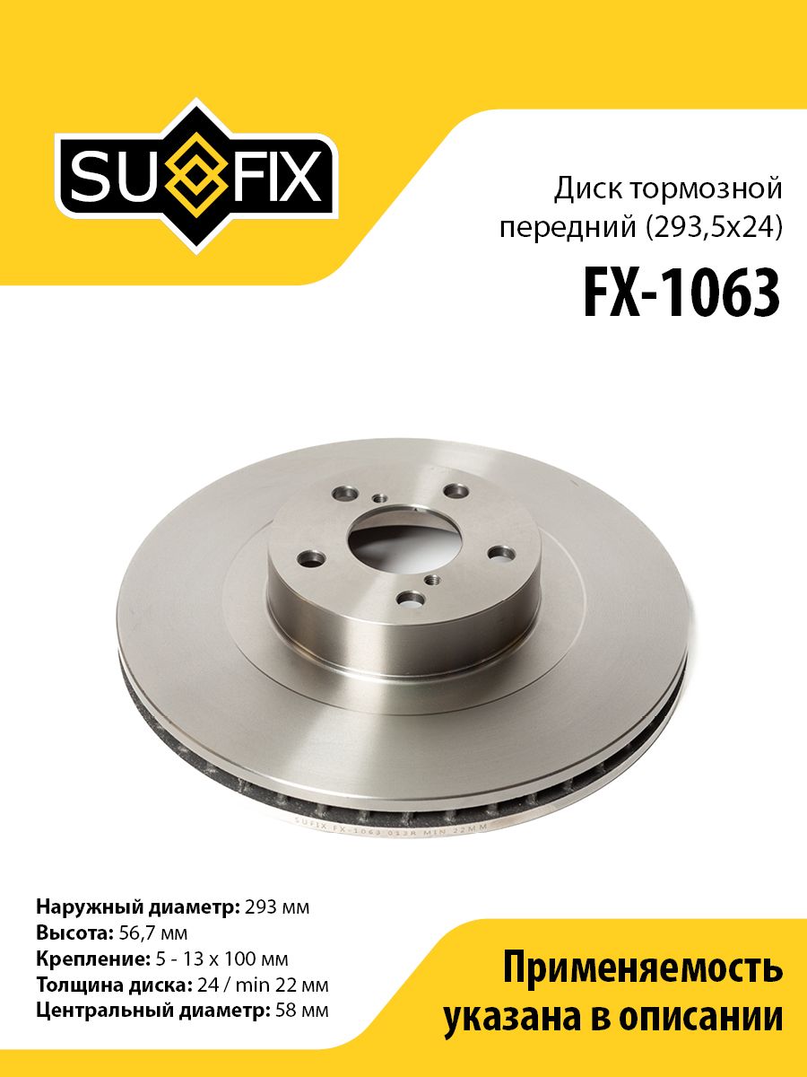 Диск тормозной передний (293,5x24) SUFIX FX-1063. Применение: SUBARU Forester(SF-SJ) 2.0-2.5 01> / Impreza(GC-GH) 2.0-2.5 98> / Legacy III-V 2.0D-3.0 00> / XV 1.6-2.0 12>.