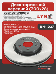 Диск тормозной передний (300x28) LYNXauto BN-1027. Применение: FORD Mondeo IV 1.6-2.5 07-14 / Kuga I 2.0D-2.5 08-12 / Galaxy/S-Max 1.6-2.3 06-15, LAND ROVER Freelander 2 2.0-3.2 06-14 / Range Rover Evoque 2.0-2.2D 11>. VOLVO S60 II 1.5-3.0 10> / S80 II 1.6D-4.4 08> / XC70 II 2.4D-3.2 07>. Высота, мм- 52,0. Центрирующий диаметр, мм- 63,5. Диаметр отверстий, шпилек / PCD, мм- d 15,8 / PCD 108.