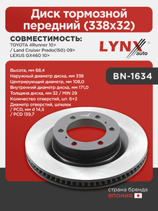 Диск тормозной передний (338x32) LYNXauto BN-1634. Для: Toyota, Тойота, 4Runner 10> / Land Cruiser(ЛэндКрузер) Prado(Прадо)(150) 09>, Lexus, Лексус, GX460 10>. Высота, мм 68,4.