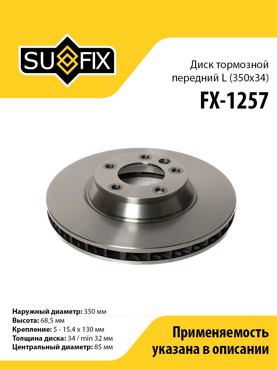 Диск тормозной передний L (350x34) SUFIX FX-1257. Применение: AUDI Q7 3.0D-6.0D 06-15, VW Touareg(7L) 2.5D-6.0 02-10, PORSCHE Cayenne I-II 3.0-4.8T 03> / Panamera 4.8T 09>.