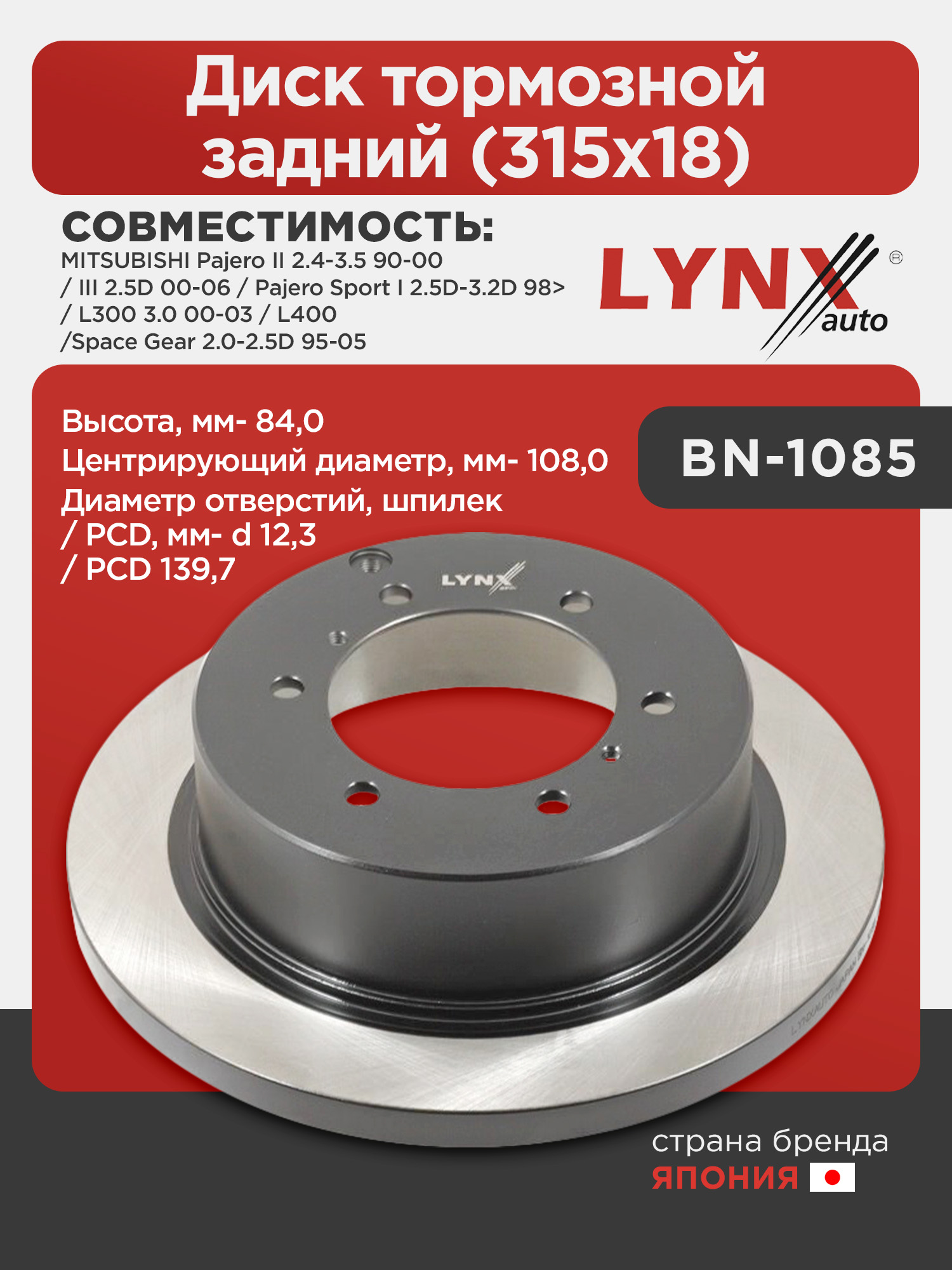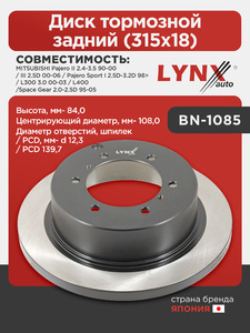 Диск тормозной задний (315x18) LYNXauto BN-1085. Применение: MITSUBISHI Pajero II 2.4-3.5 90-00 / III 2.5D 00-06 / Pajero Sport I 2.5D-3.2D 98> / L300 3.0 00-03 / L400/Space Gear 2.0-2.5D 95-05. Высота, мм- 84,0. Центрирующий диаметр, мм- 108,0. Диаметр отверстий, шпилек / PCD, мм- d 12,3 / PCD 139,7.