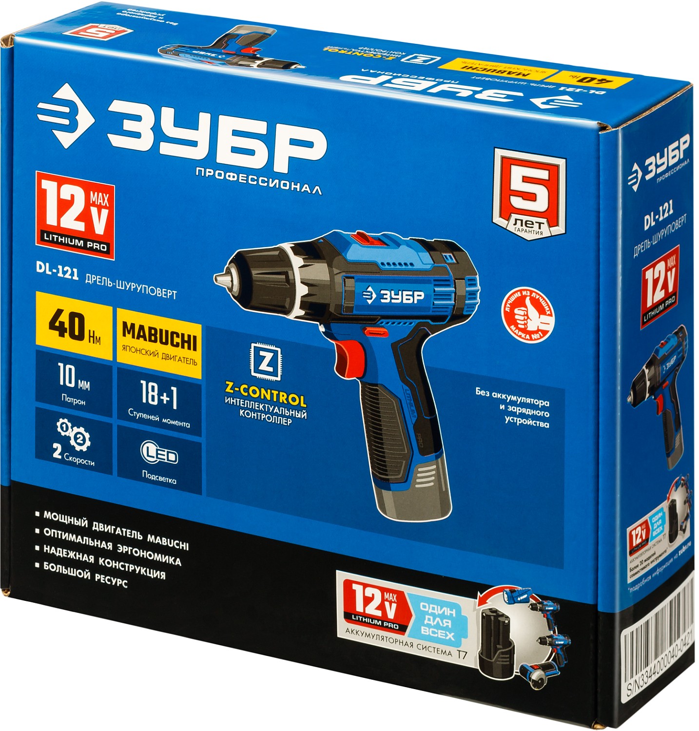 Дрель-шуруповерт ЗУБР 12 В, 40 Н·м, без АКБ (тип Т7), Профессионал (DL-121)