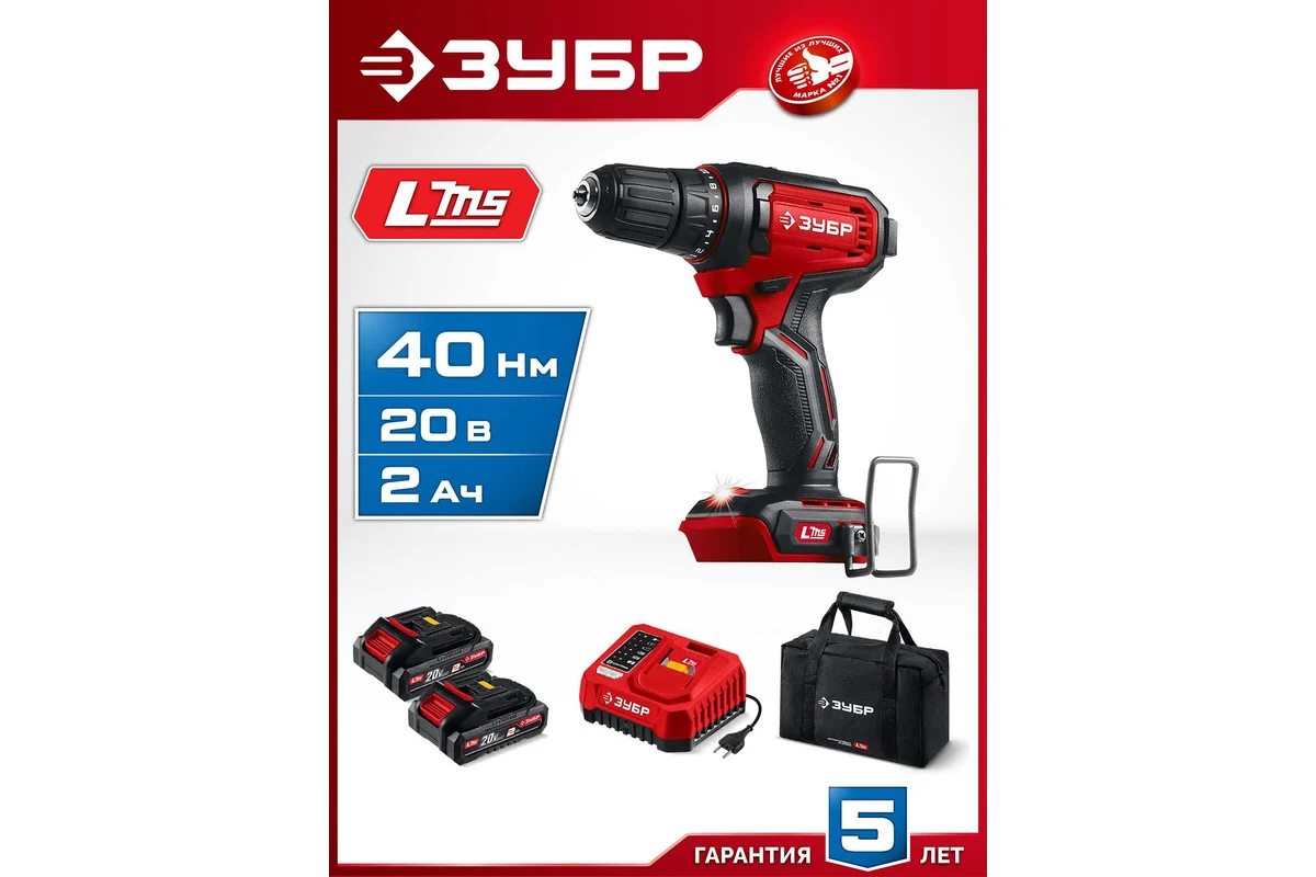 ЗУБР 20 В, 40 Н·м, 2 АКБ LMS (2 А·ч), дрель-шуруповерт, сумка ДШ-40-22 - инструмент из единой аккумуляторной системы LMS для 500+ инструментов.