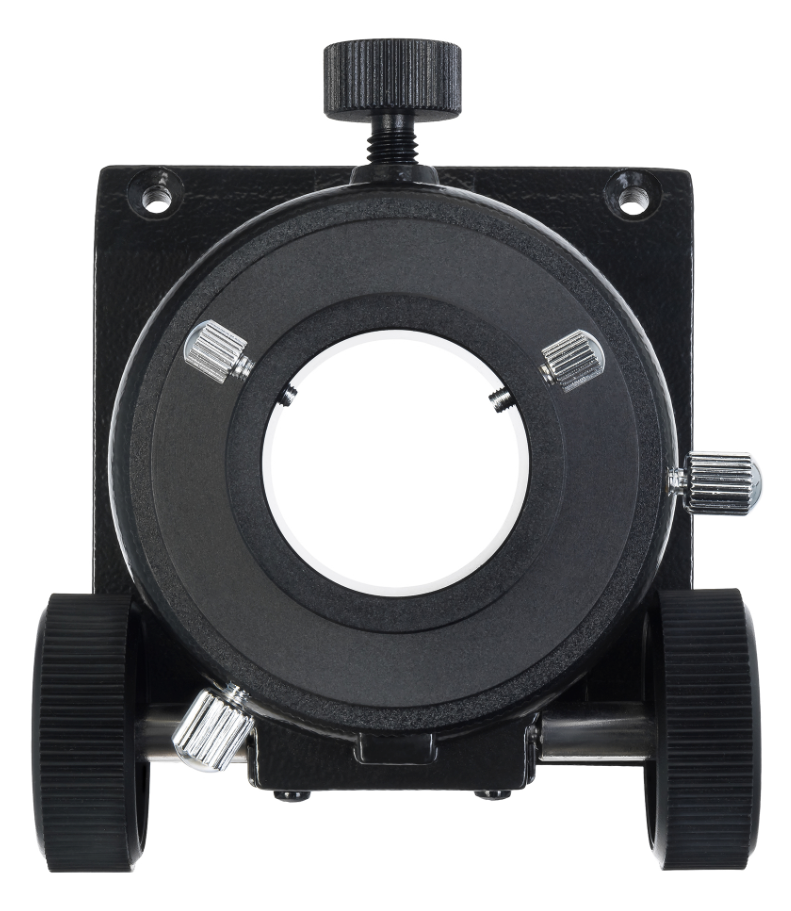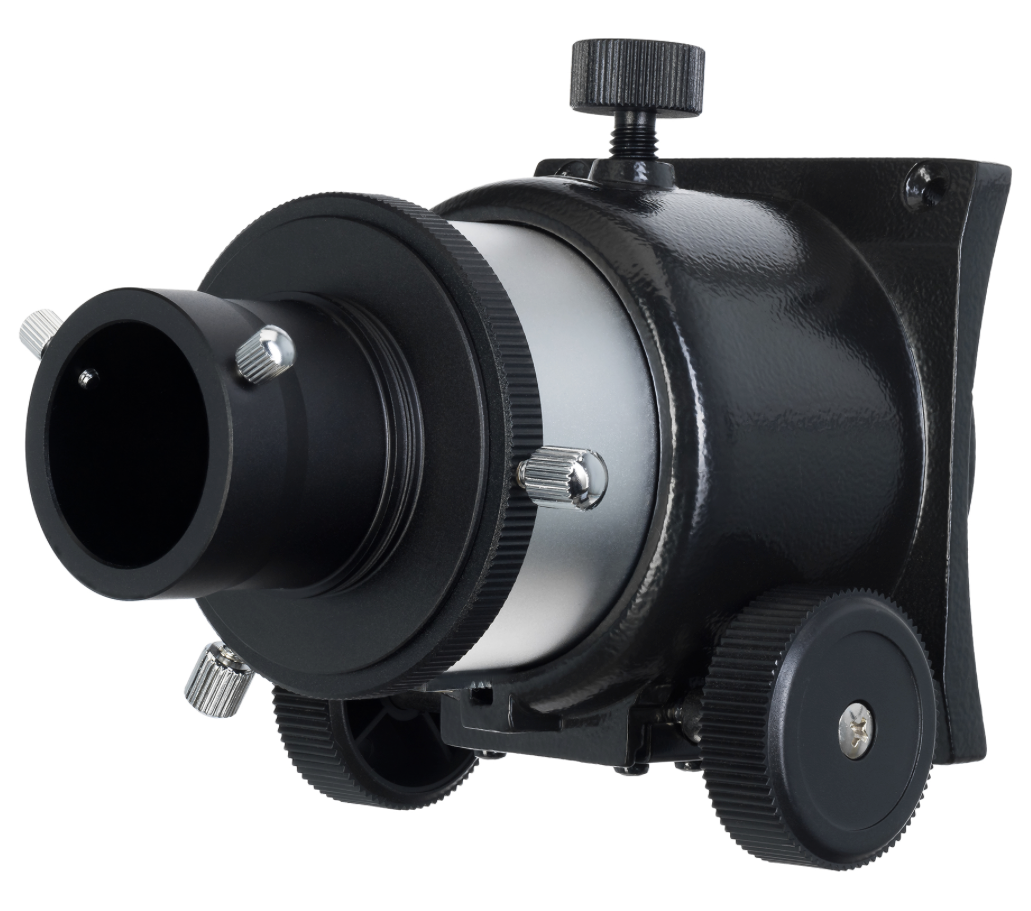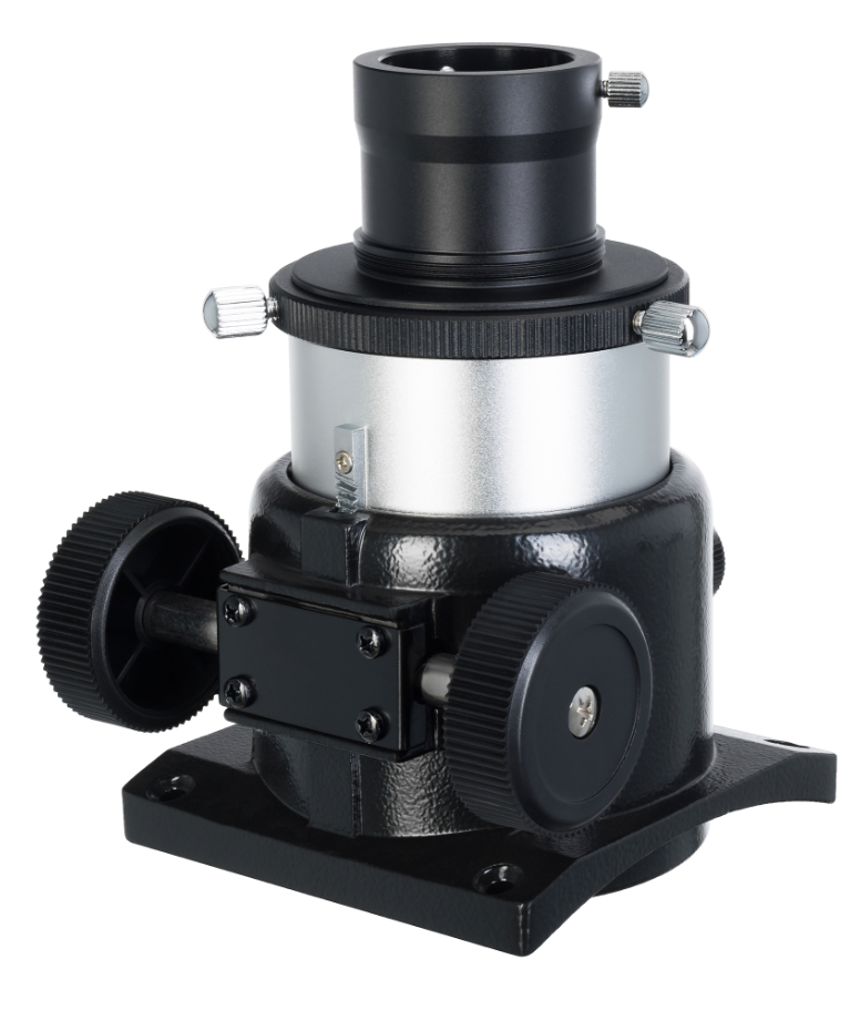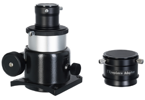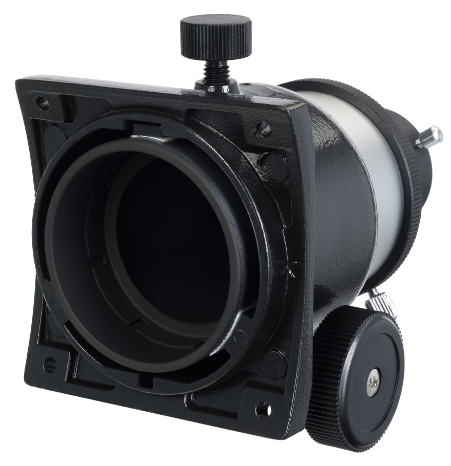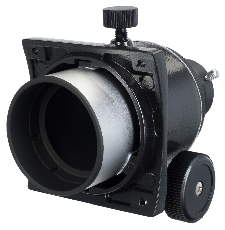 Фокусер служит для крепления окуляра в трубе телескопа и наведения резкости изображения. В основе механизма лежит система реечной передачи: две трубки разного диаметра, меньшая из которых имеет зубчатую рейку и вставлена в трубку большего диаметра. Та, в свою очередь, оснащена зубчатым колесом. При вращении ручки фокусера малая трубка перемещается и смещает окуляр. Такой механизм создает достаточно плавное для любительских и бюджетных телескопов движение оптической трубки. Посадочный диаметр фокусера – 2 дюйма, в комплект входит адаптер с 2 дюймов на 1,25 дюйма, что позволяет использовать устанавливать в фокусер окуляры с любым посадочным диаметром.