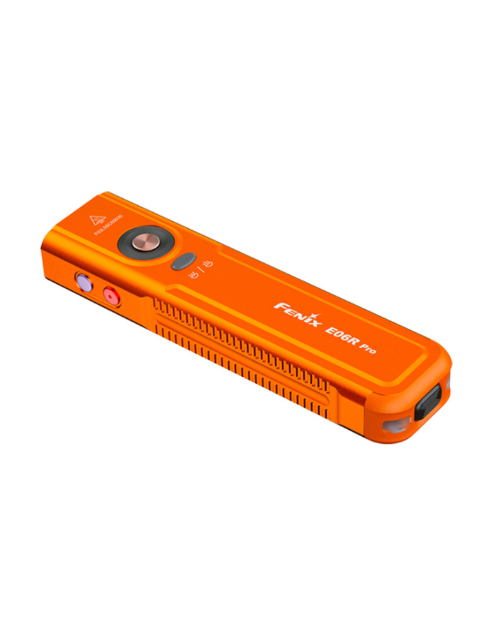 Fenix E06R Pro оснащён несколькими видами света для разных задач. Белый дальний свет с чётким сфокусированным лучом,нейтральный ближний — с мягким рассеянным освещением; при необходимости их можно использовать одновременно в комбинированном режиме. Также в фонаре есть ультрафиолетовый свет, для проверки документов, ремонта техники и других специфических задач, красный свет — для работы в темноте без потери ночного зрения, и RGB-подсветка, которую можно использовать как сигнальную или декоративную. Дополняет функциональность красный лазер, позволяющий точно указывать объекты или подавать визуальный сигнал.