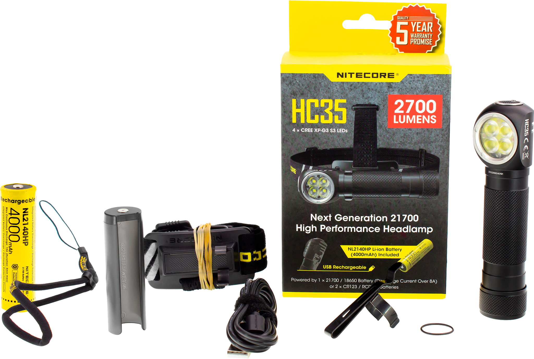 Фонарь HC35, Li-Ion аккумулятор NITECORE 21700 (NL2140HP 4000 мАч), запасное уплотнительное кольцо, темляк, налобное крепление, клипса, переходник для аккумулятора 18650/CR123, USB-кабель для зарядки.