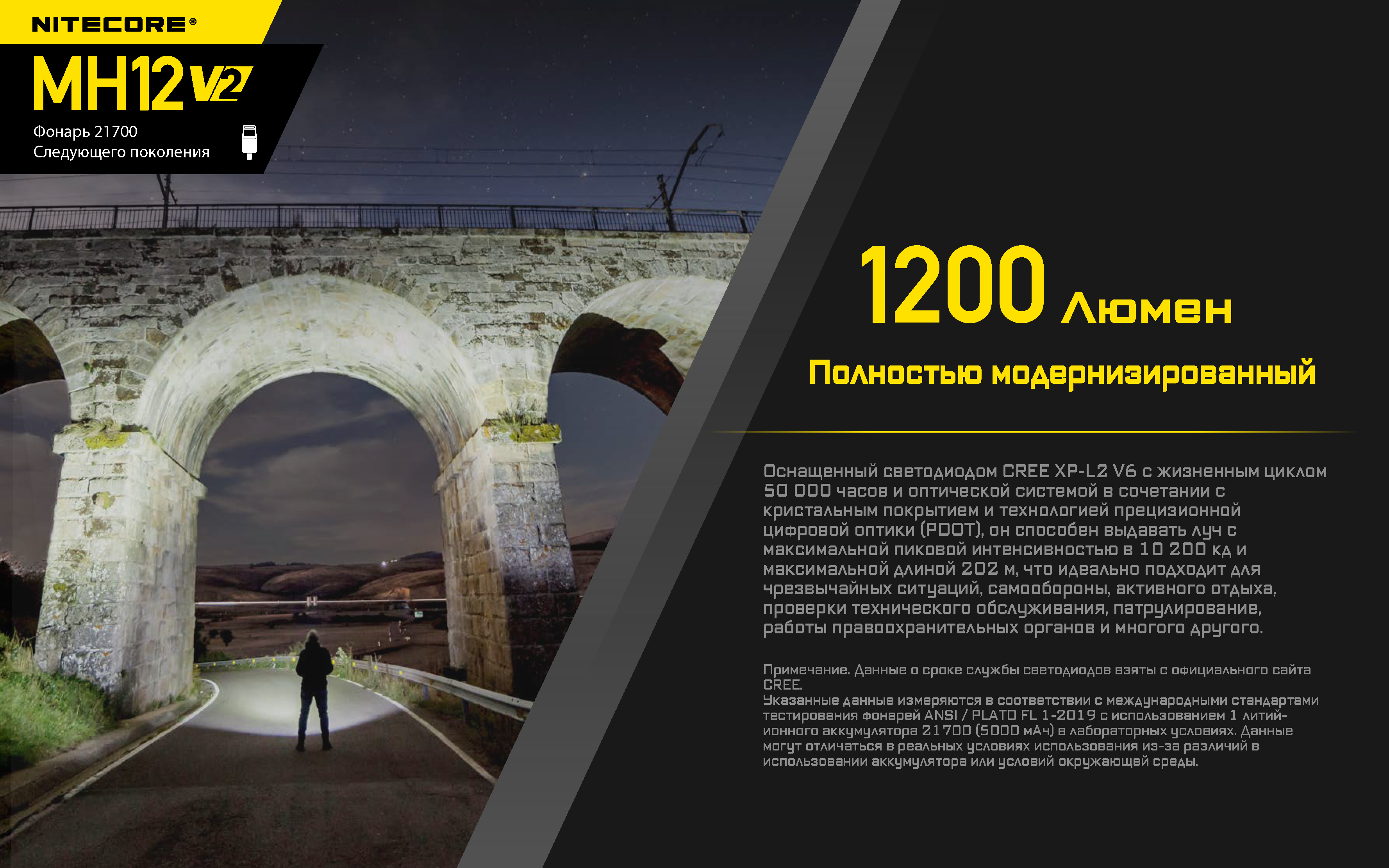 MH12 V2 - это усовершенствованная модель своего предшественника MH12. Максимальная мощность светодиода составляет 1200 люмен с дальностью освещения до 202 метров. Время непрерывной работы возросло до 1500 часов (более 60 суток) благодаря использованию аккумулятора 21700.